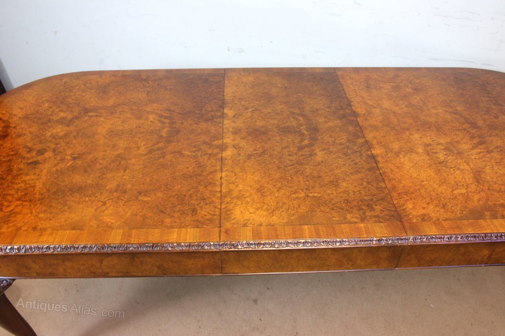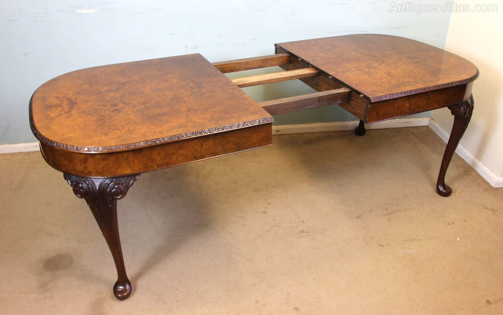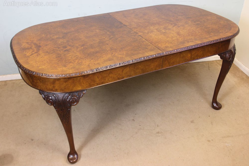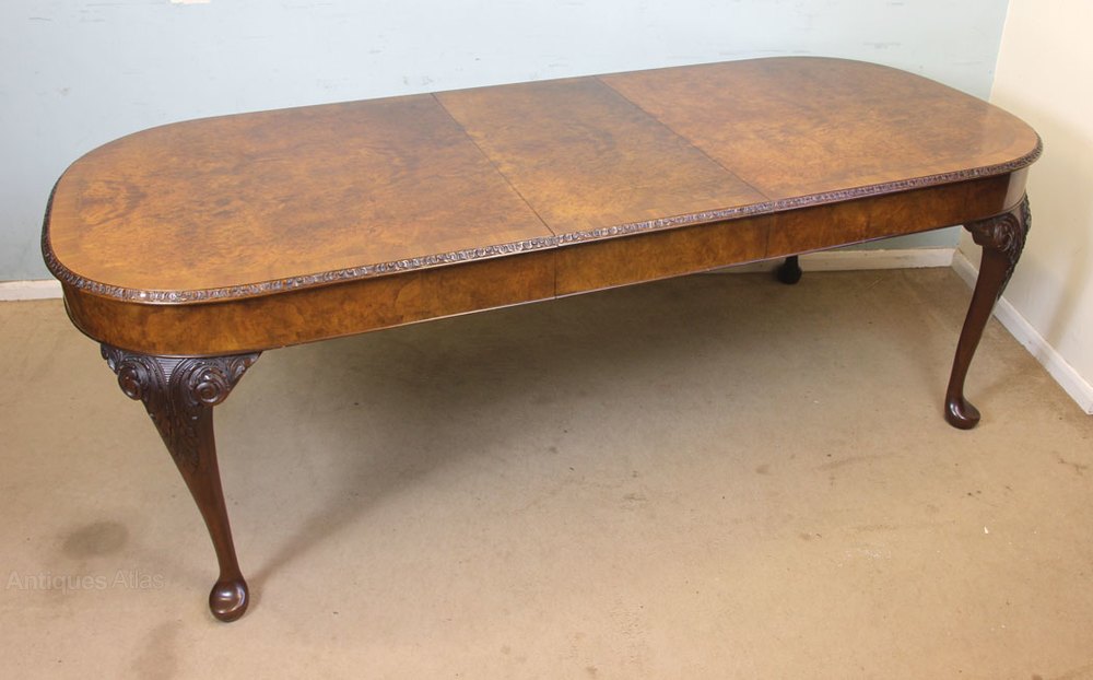 Antique Burr Walnut Queen Anne Style Extending Dining Table. This wonderful burr walnut extending dining table has one leaf this can be taken out to make a smaller table. Having a lovely figured walnut top with carved edge. With figured walnut skirt under and all supported by carved queen anne style legs and pad feet.