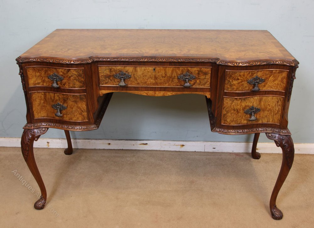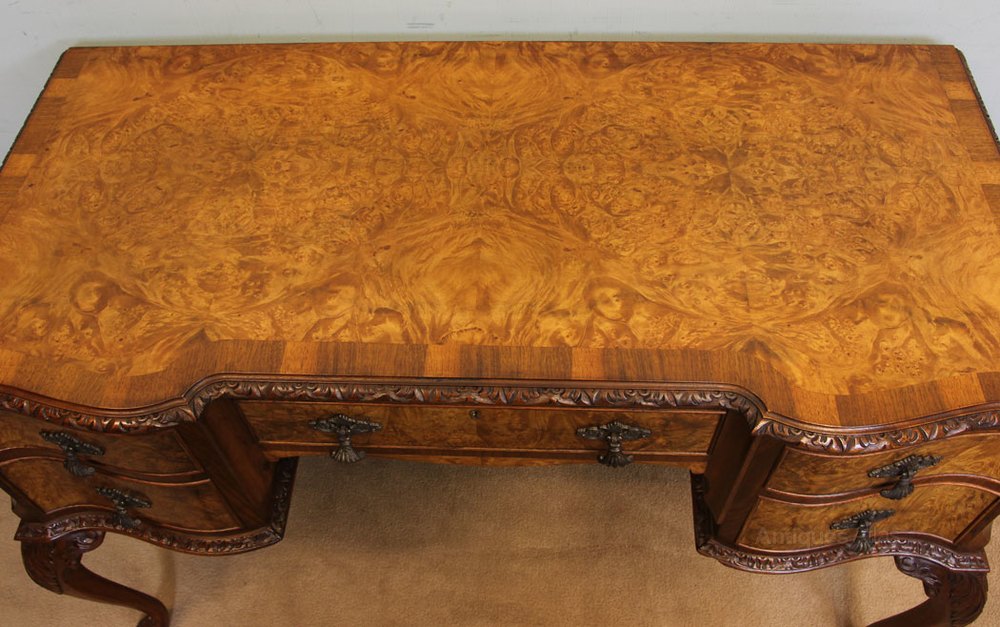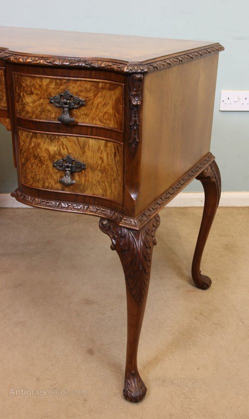 Burr Walnut Writing Side Table / Dressing Table, Antique burr walnut writing side table / dressing table has a lovely burr walnut shaped top that is crossbanded and has a carved edge under there is a centre drawer flanked either side by serpentine shaped drawers. The Dressing Table is supported by queen anne style legs with carved decoration.