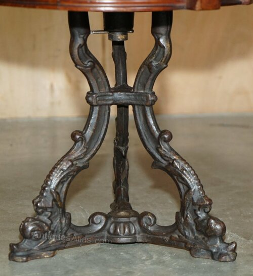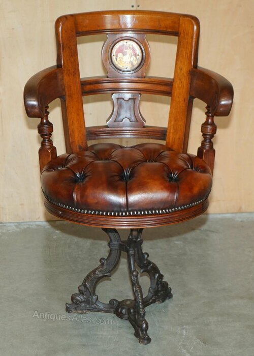 This chair is a good looking and well made original Victorian example, circa 1840-1850, the frame is Mahogany has been hand sawn and crafted, it has a hand painted Queen Victoria mural to the back rest sitting in the Regal position, on this chair the painting is patinated in places but its in the best condition of the three chairs. The base of the chair is painted black, it cast iron and it depicts three dolphins, these are not the dolphins as we know of them today, these are what sailors depicted dolphins as in the early 19th century