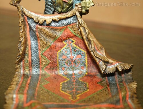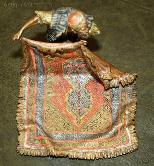 An excellent early 20th Century Austrian cold painted bronze lamp of an Arab man selling a highly detailed Oriental carpet, with very fine colour and carefully chased surface detail