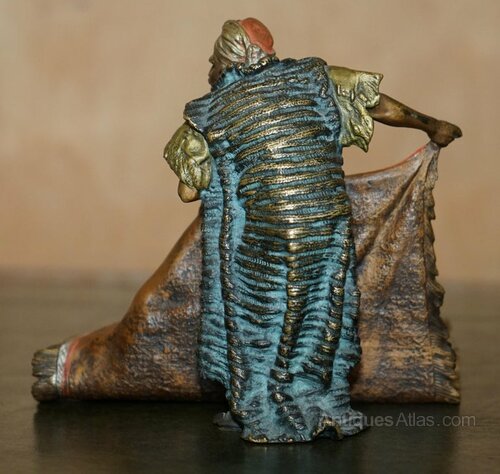 The return trip would usually include a visit to Vienna, and here the ‘souvenir’ shops supplied a plethora of beautifully crafted sculptures with an Orientalist Arab flavour. These were often acquired to show their friends and families images of their travels. Bergman was noted for his detailed and colourful work and he produced a huge number of Orientalist subjects to cater for this market including this impressive lamp