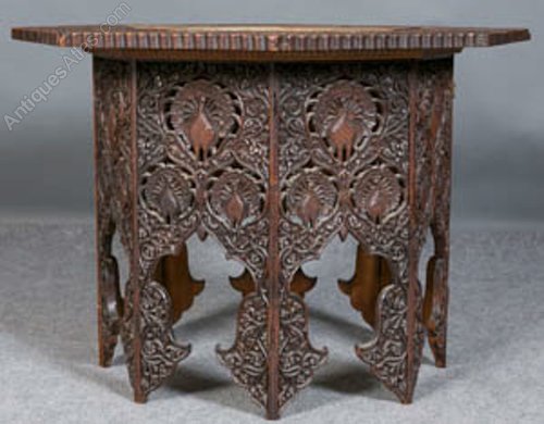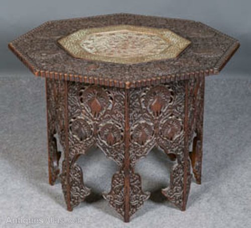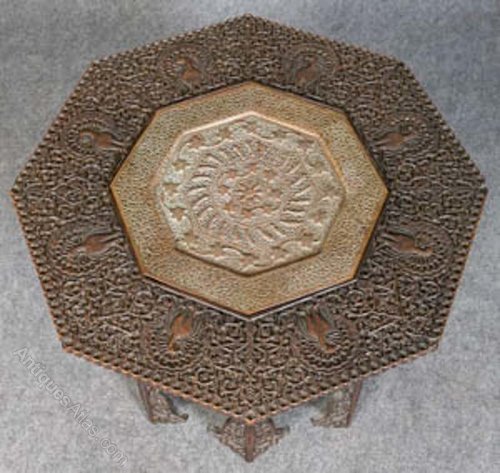 C19th carved Eastern octagonal table , with carved peacock decoration,top with pierced copper inset tray,