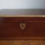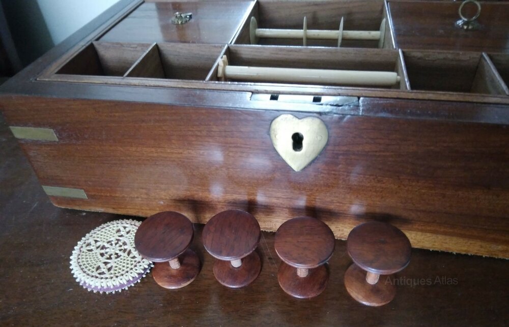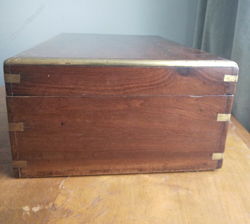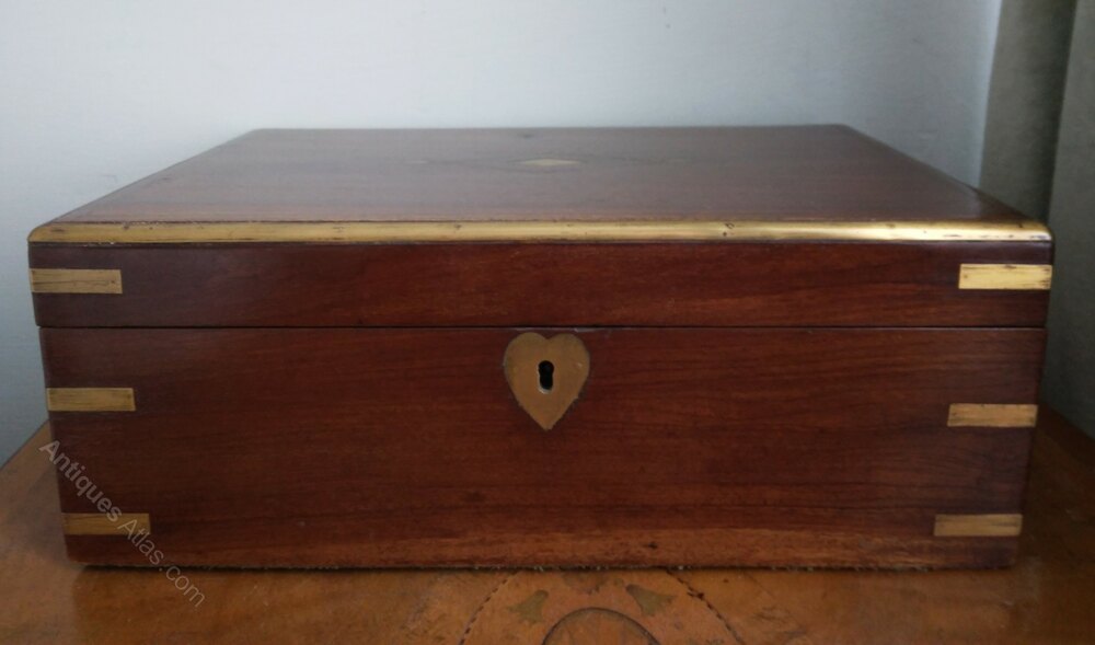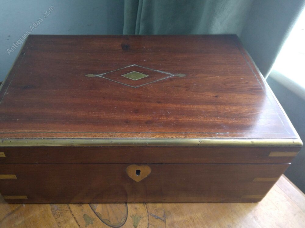 An antique campaign sewing and jewellery box, brass bound. It measures 12 1/2″ x 8 1/2″ x 4 1/4″ and weighs over 2 1/2 kilos. Made of solid exotic wood very like mahogany with brass bound corners and quarter round brass edging. It has brass fittings a heart shape escutcheon plate, brass diamond inlay, and rope twist inlay to the top. Inside, the usual compartments for sewing tools or jewellery. Some of the original bovine bone fittings remain. There is a mirror in the lid which is removable. There is also a large storage area under the removable tray. This most probably belonged to a British army officer’s wife. All sound, and made to last forever. For UK buyers only.