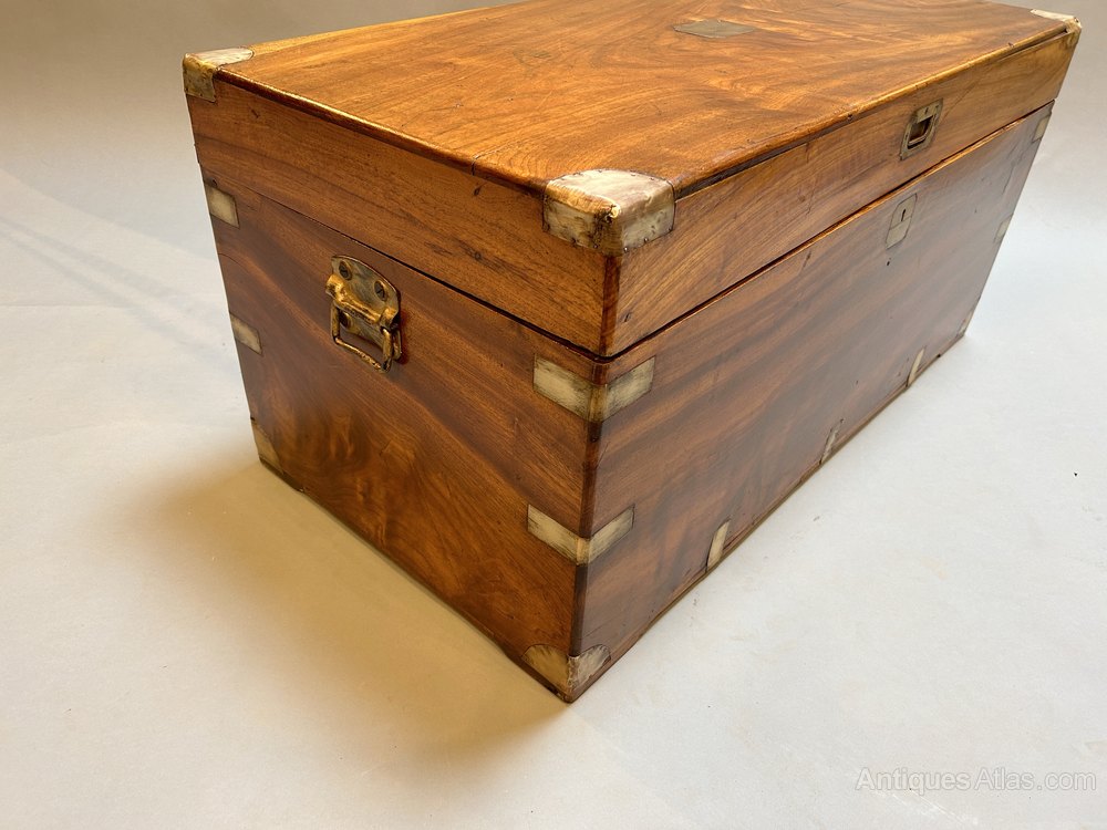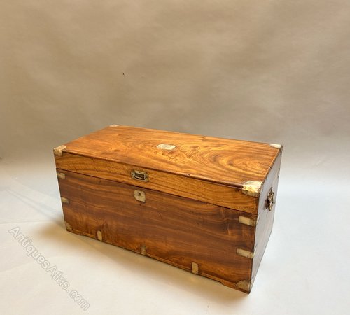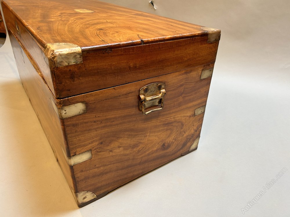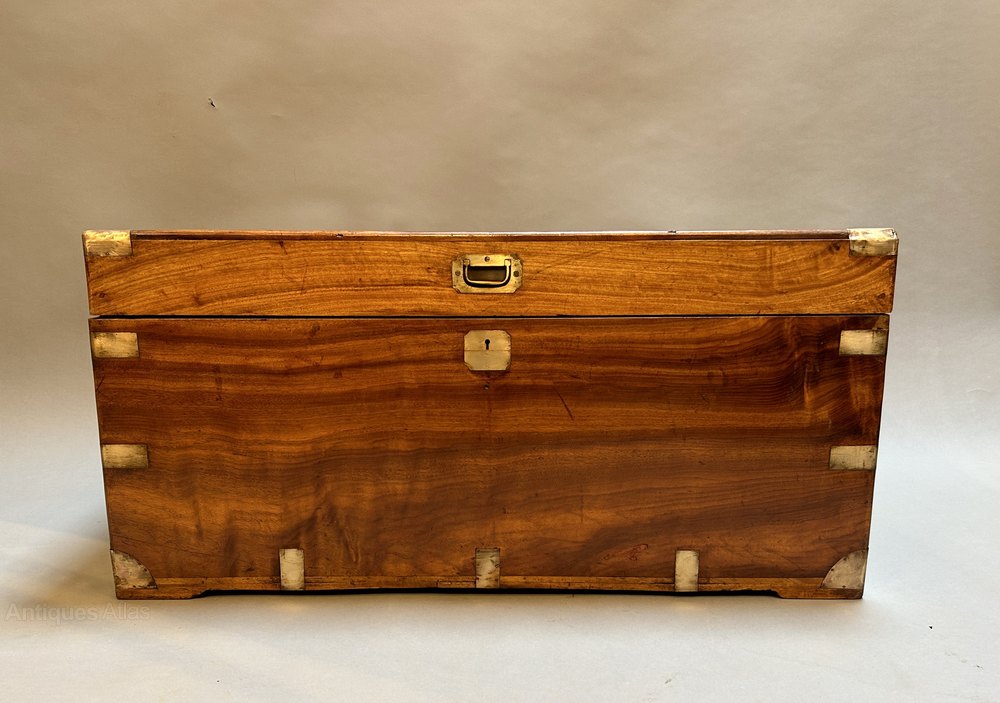 Late C19th camphor of good colour and exceptional figuring , brass bound throughout with carrying handles and rising lid revealing vacant interior.