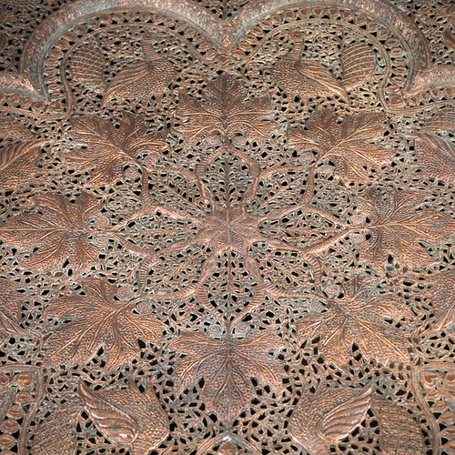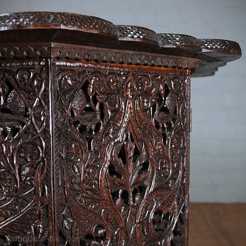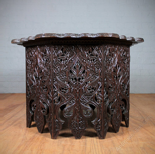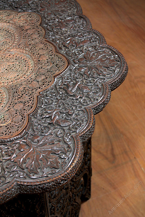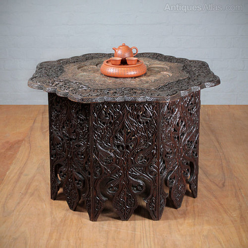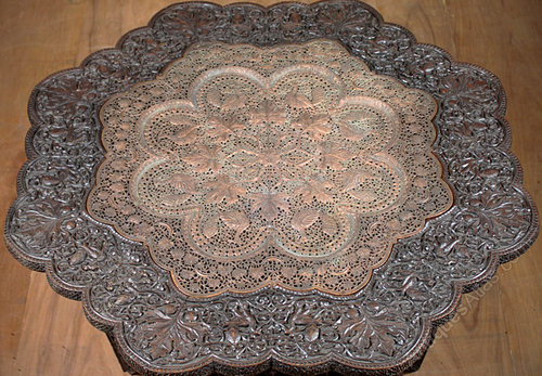 Unusually large early 20th.c. hardwood and copper octagonal folding table probably produced for the export market in India c.1920. With a densely carved and pierced design of peacocks and leaves continued across the copper insert. Excellent condition. Original throughout.