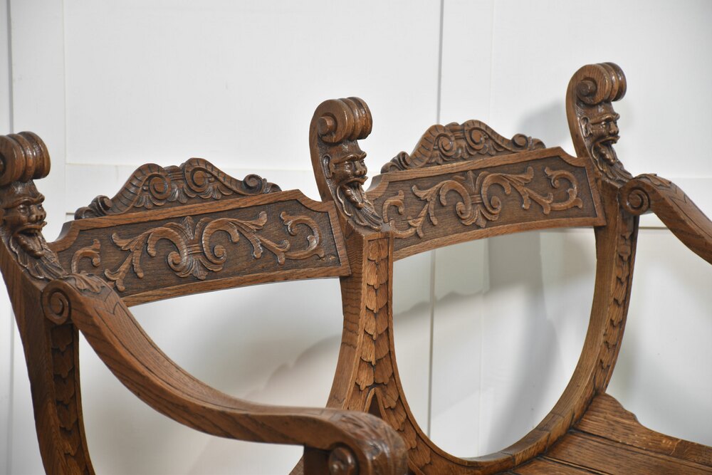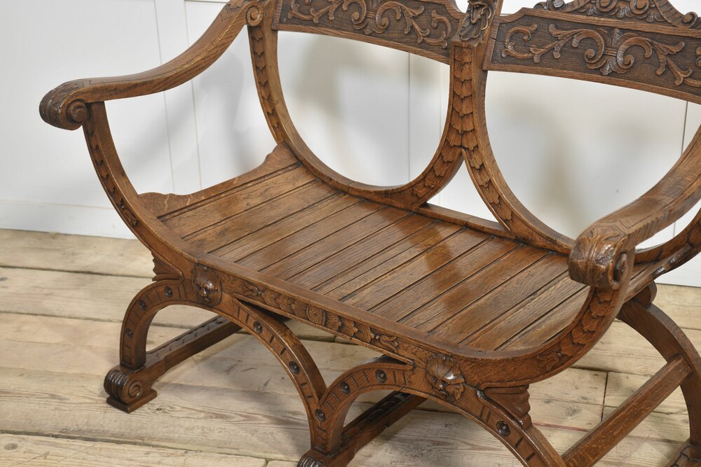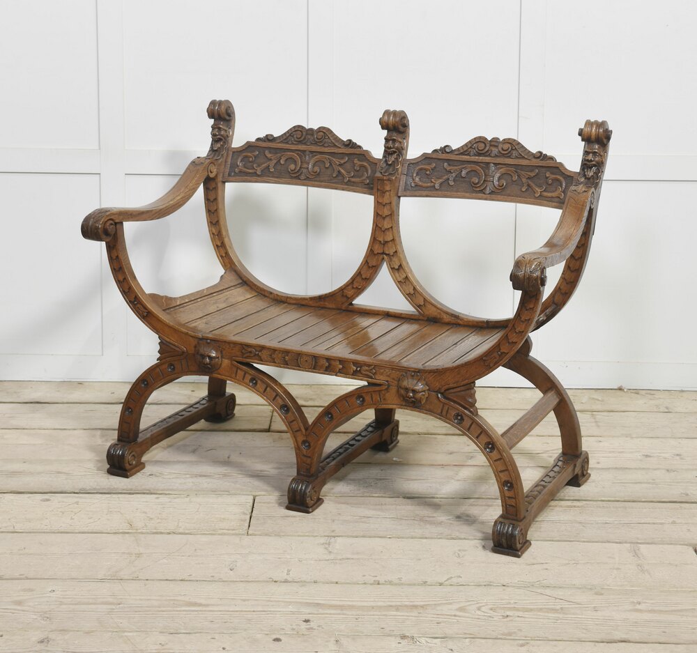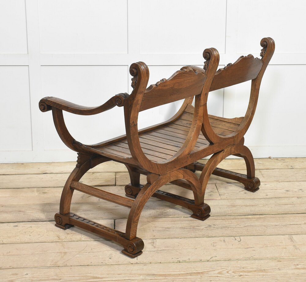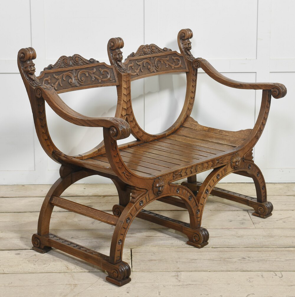 Oak bench the headed finials above carved backrests with scrolling details, above a planked seat surrounded by outswept arms. All raised on shaped legs united by stretchers.