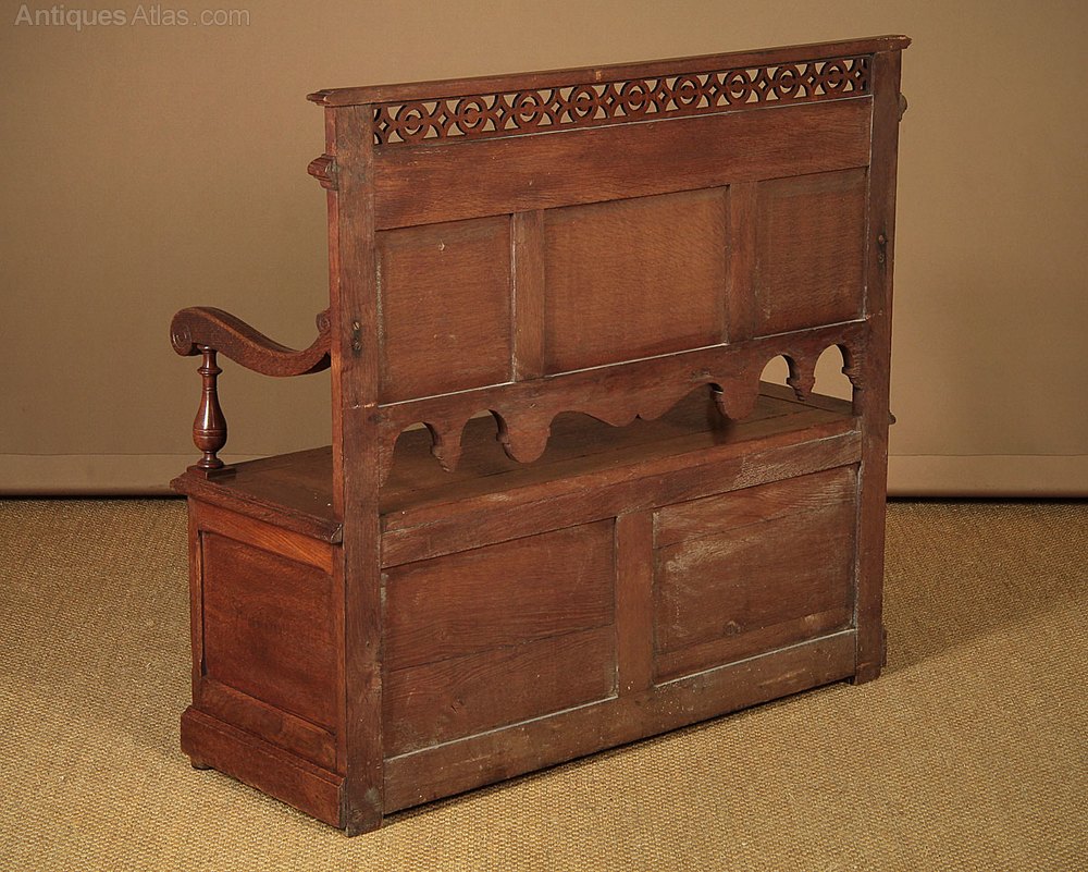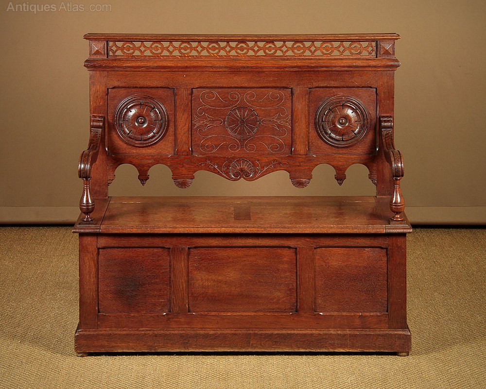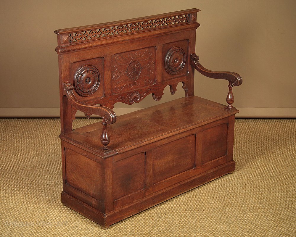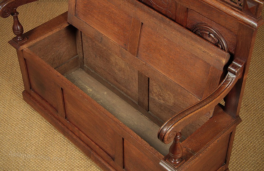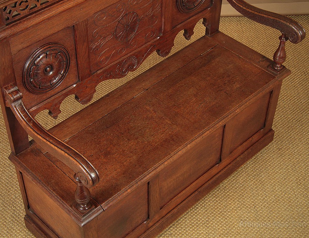 Early 20th.c. carved oak box settle or hall seat c.1920. Three panel backrest with an unusual pierced frieze across the top, crisply carved decoration and shaped bottom edge. Shaped and moulded arms with scrolling terminals on neat turned supports. Over a lift up seat with useful storage below for boots and shoes etc. Panelled front and sides to the base and a moulded plinth raised on turned foot pads. Excellent condition, restored cleaned and waxed in our workshops.