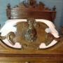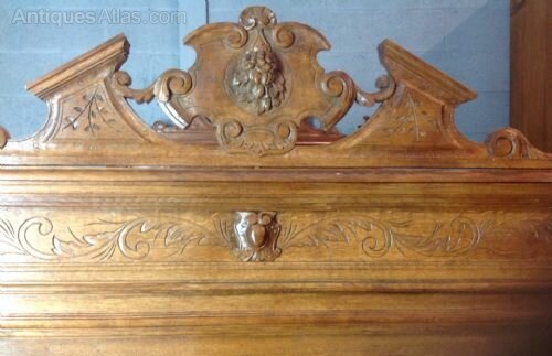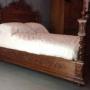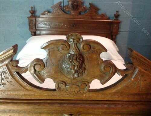 The footboard also has a pediment with a bouquet of flowers and carved panels.