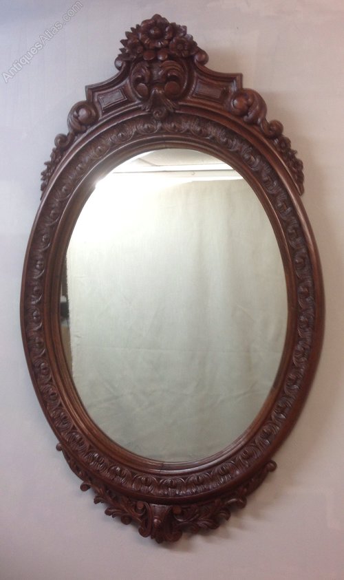 The mirror has a large oval carved frame with floral carving to the top and bottom.