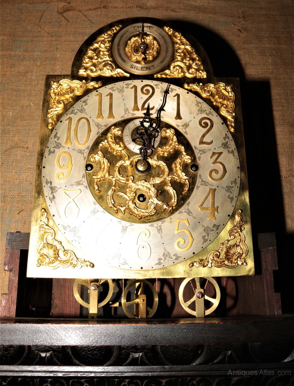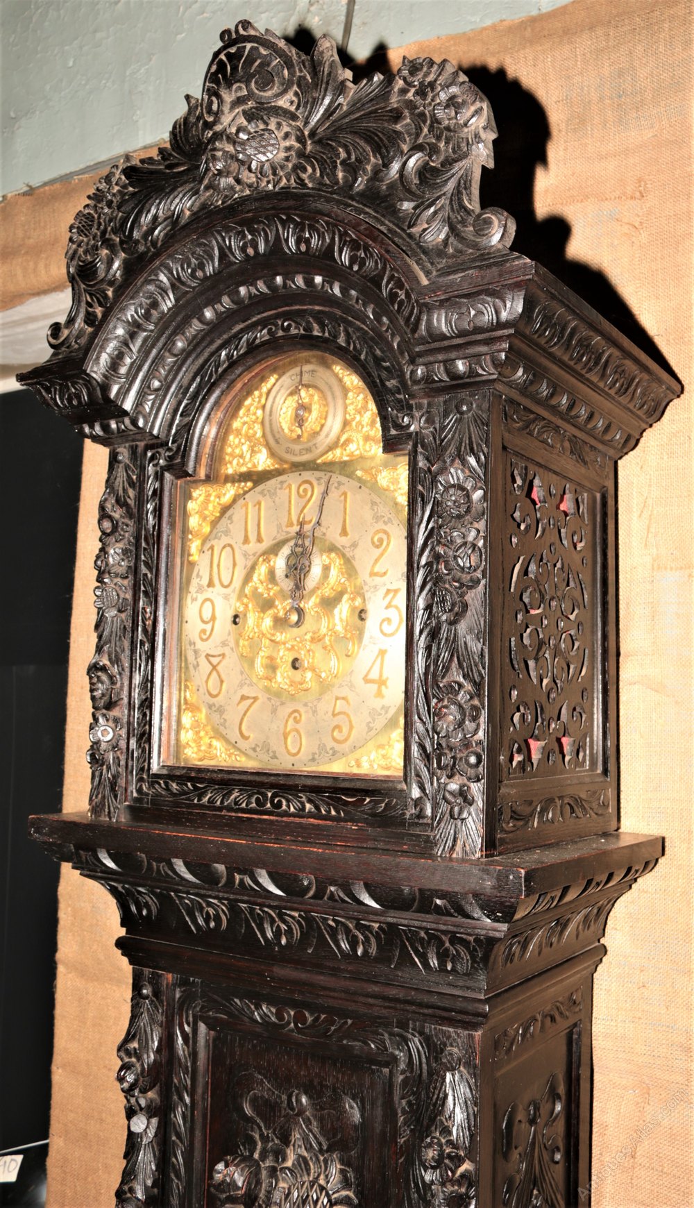here I have a heavily carved oak grandfather antique clock with a 3 weight musical movement, it has a very ornate arched dial brass face with a chime/silent dial, it chimes on gongs, the works would benefit from a clean although we have had the clock working ( I have allowed for this in the price ).