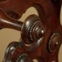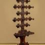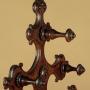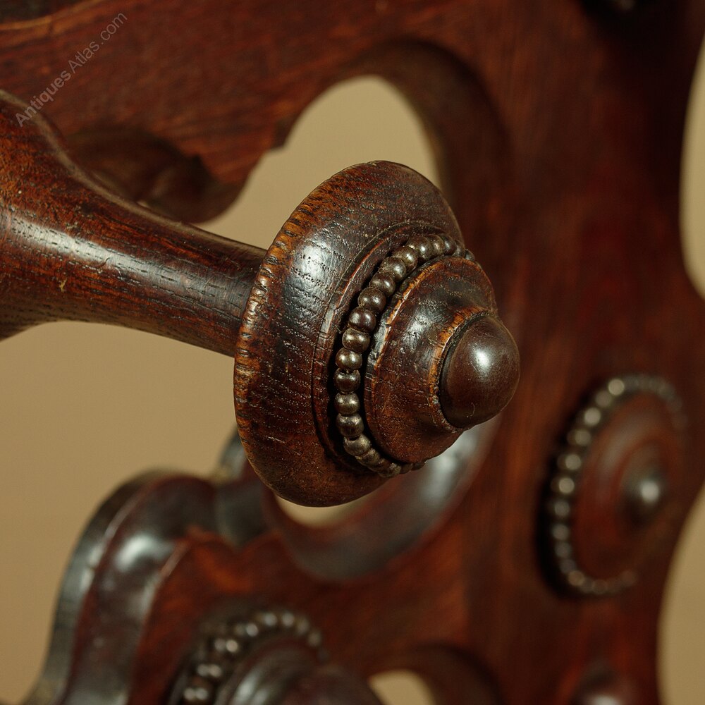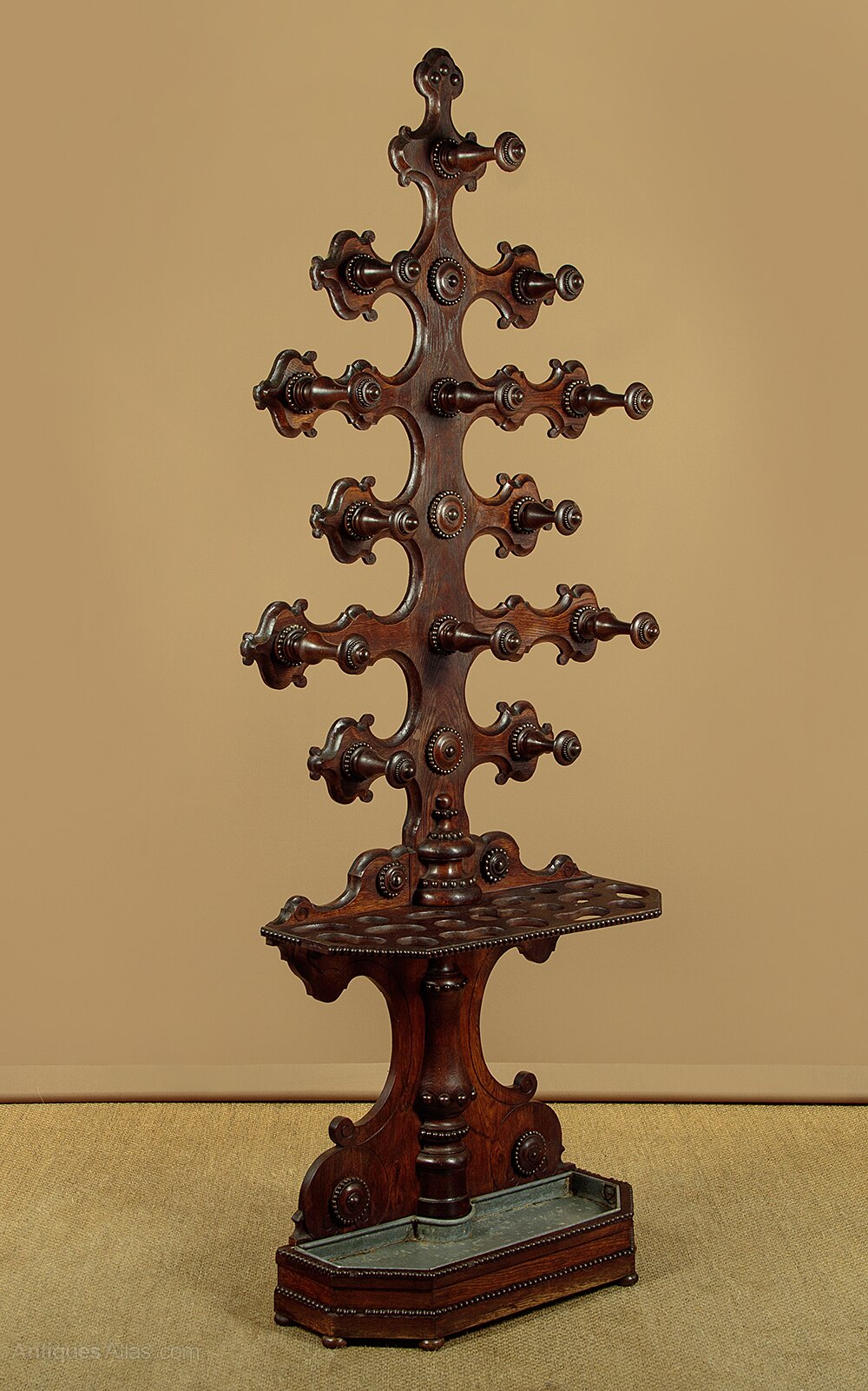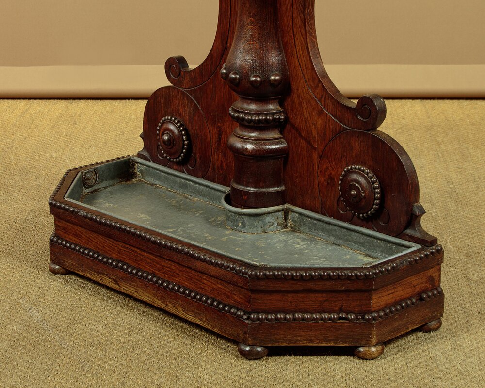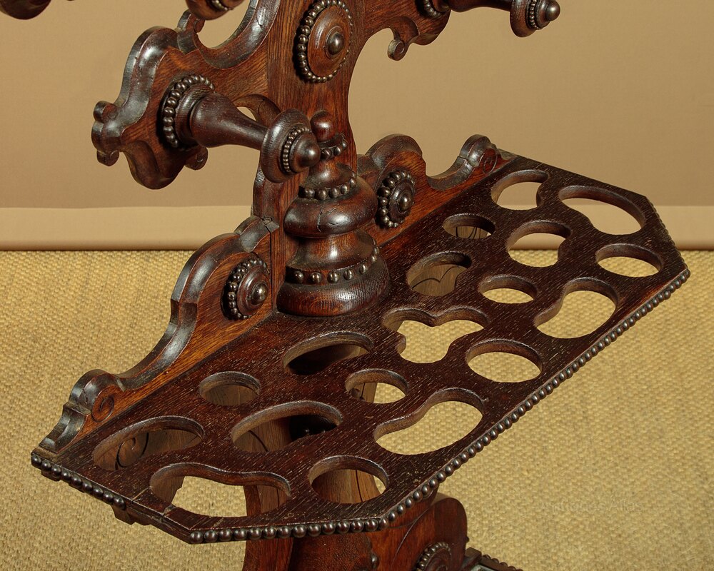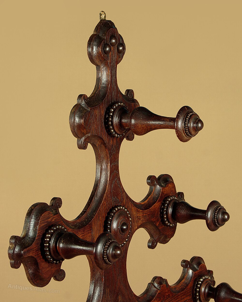 Remarkable late 19th.c. hallstand or hall tree c.1890. Thirteen large turned hooks for hats and coats etc. arranged across the 10 beautifully shaped and moulded branches. Over a stick and umbrella stand with 18 variously shaped holes and a removable metal drip tray in the base. In oak with turned and carved detail and applied steel bead mouldings. Fixing bracket at the top to secure to the wall. Missing a few small portions of the bead moulding. Otherwise very good condition and excellent colour. Cleaned and waxed in our workshops.