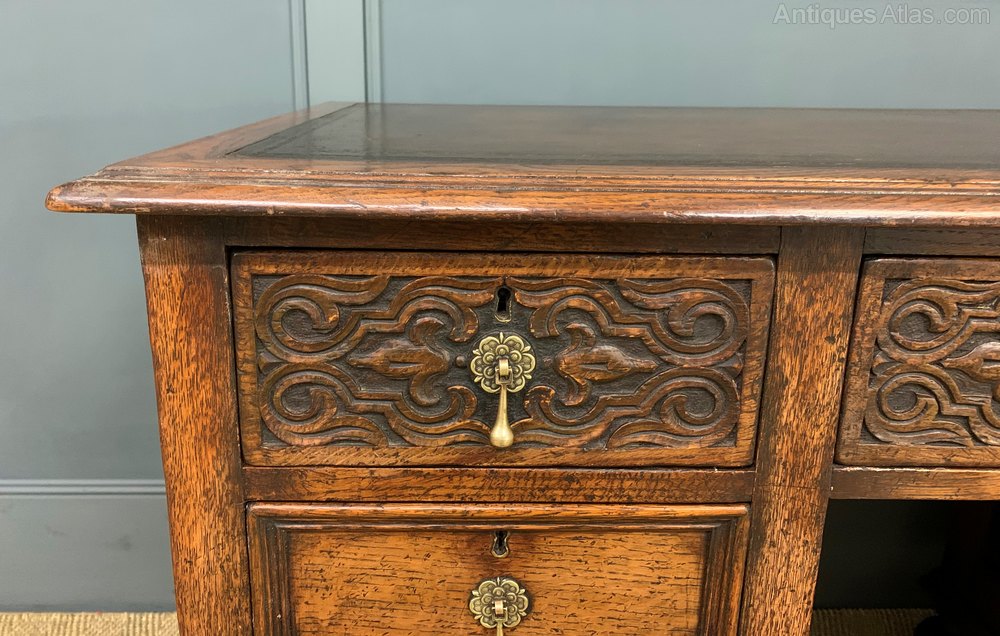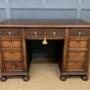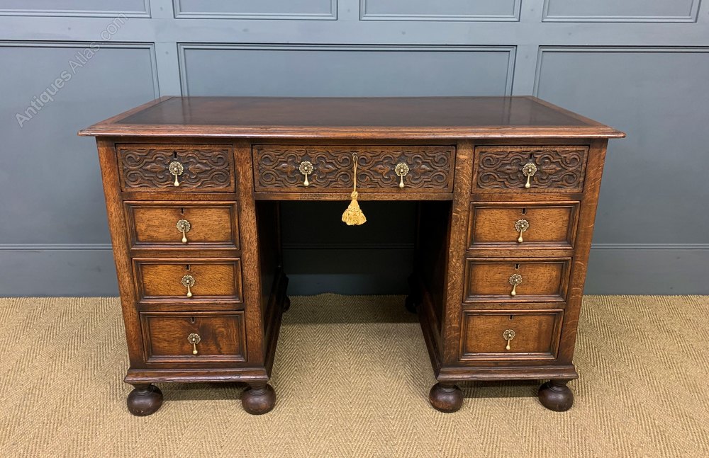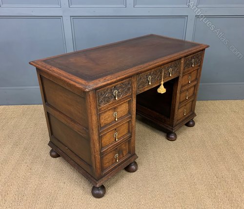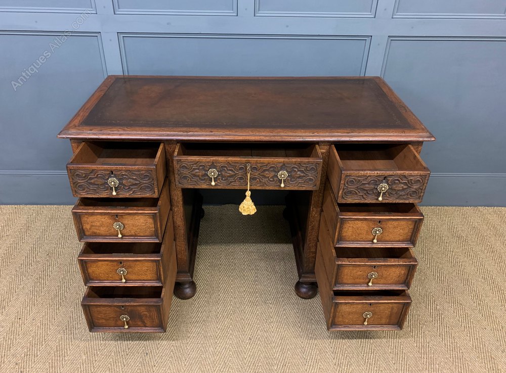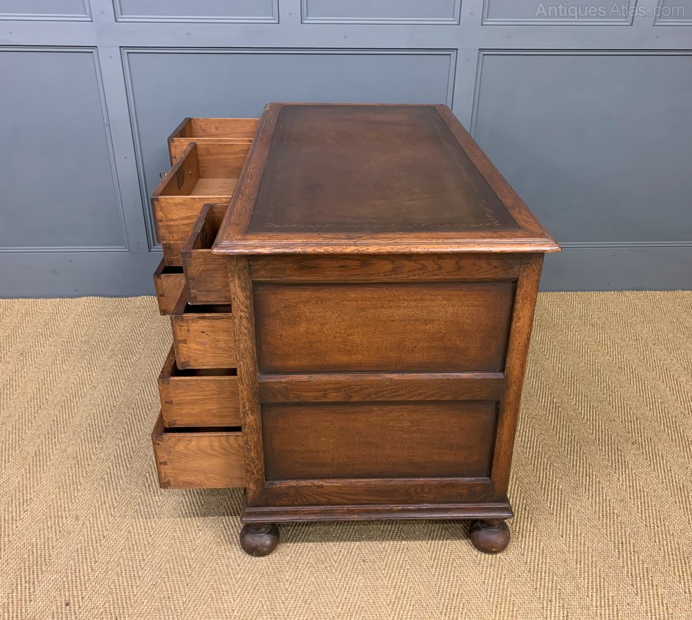 A very good early 20th century carved oak pedestal desk. Well constructed in solid English oak, now with a great colour and patina. The top inset with a sumptuous leather writing surface, complete with gilt tooled decoration to the surrounds. With a series of 9 drawers all fitted with their original solid brass drop handles and all lockable (key supplied). The top 3 drawers decorated with carved detailing. The whole desk standing on bun feet. This desk is finished to the rear so could be free standing within a room if desired. Cleaned and waxed in our workshops and now offered for sale in excellent condition, with a good colour and patina. Ready to go straight into the home or office.