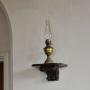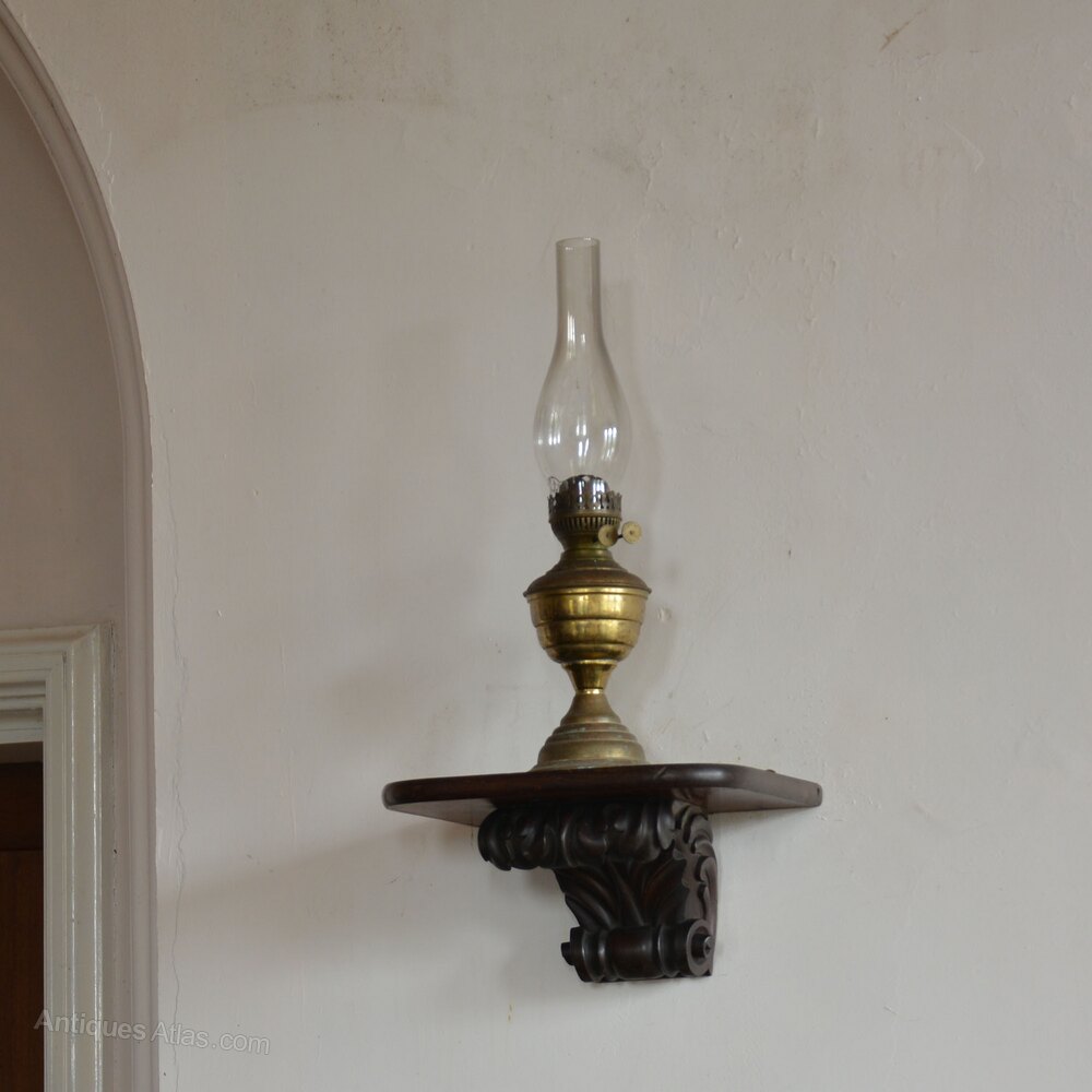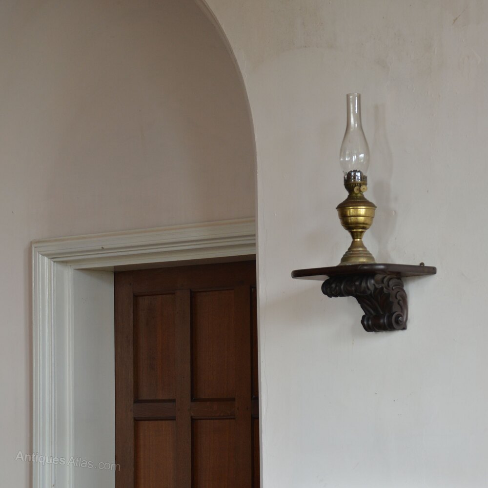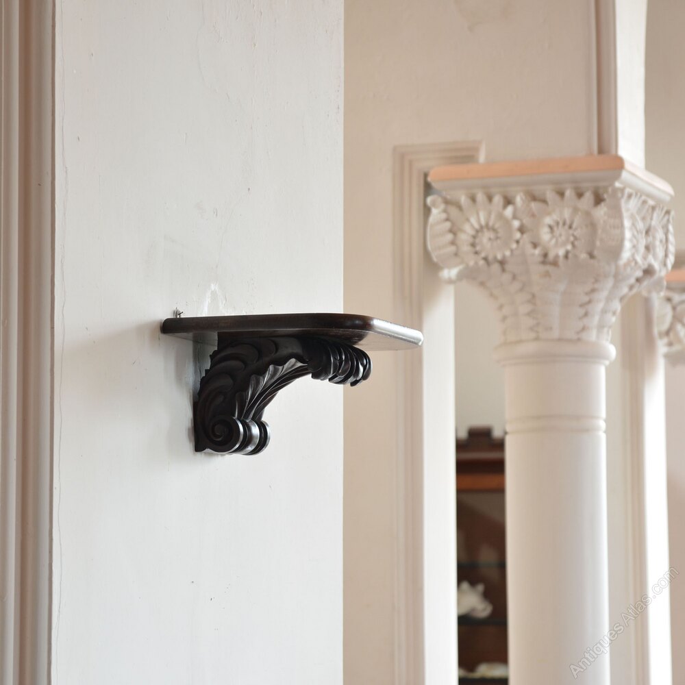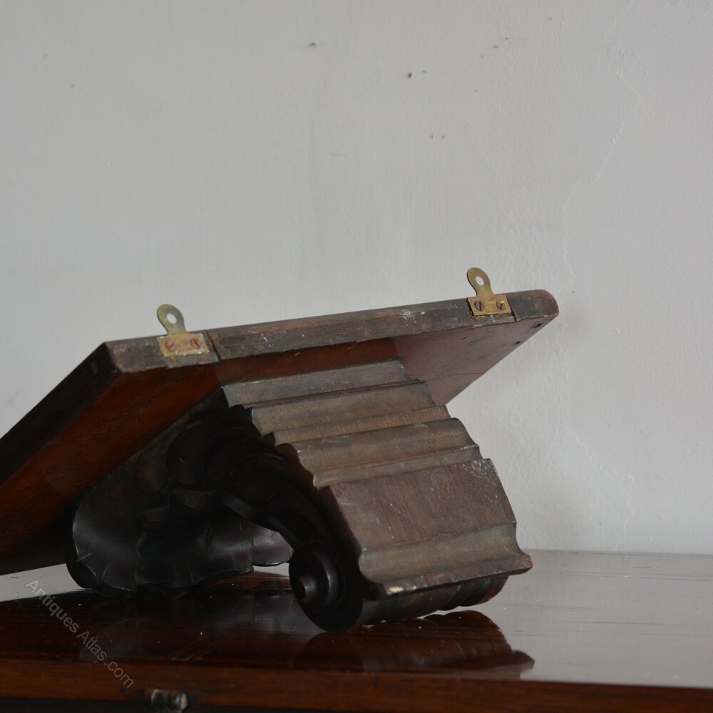 A well carved acanthus leaf corbel supports a mahogany shelf, hangs on a pair of brass fish plates.