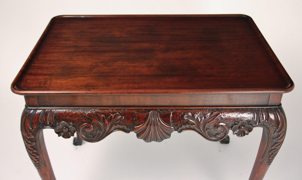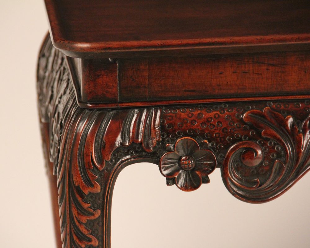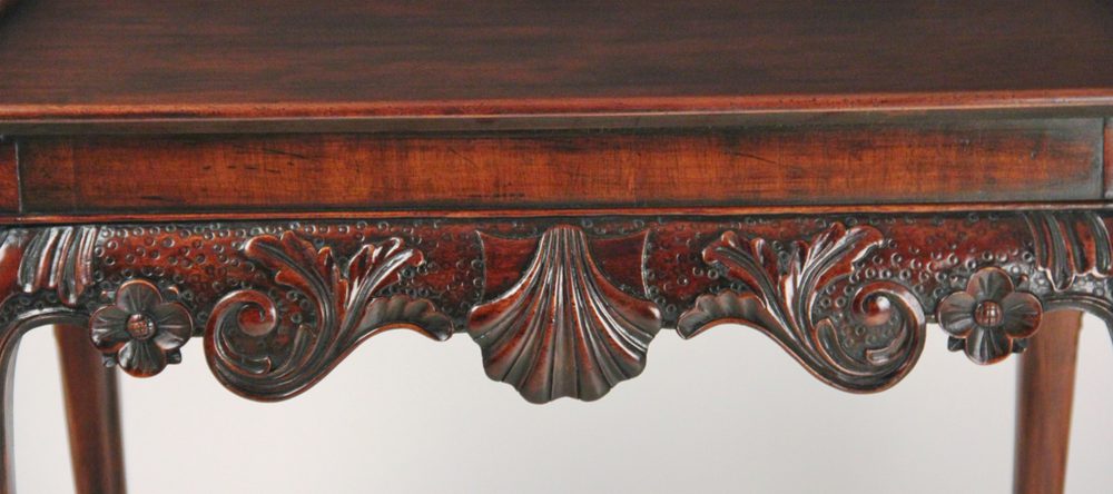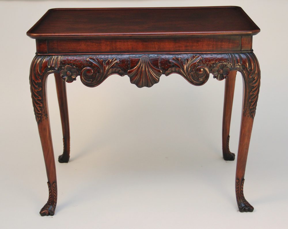 Carved mahogany silver table, the dish rounded rectangular top above a shell and scroll carved frieze, supported on acanthus headed cabriole legs.