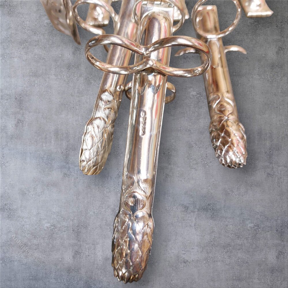 A very good antique English set of 12 silver plated Asparagus eaters and serving tongs. Rare to find sets of 12. Dating to the early 1900s and in superb condition with no wear to the silver plate. Each asparagus holder is 5" long and to be held with two fingers and the thumb. Fabulous for fine dining.