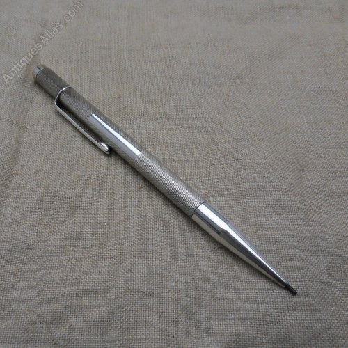 A very handsome solid silver Propelling Pencil made by Cohen & Charles and hallmarked Birmingham 1965. These hallmarks are clearly visible on one side of the pencil. Nicely designed and good to hold in the hand, the pencil is decorated with a lovely engine turned pattern with a rectangular empty cartouche on one side. The pencil is operated by a turn at the top to allow the lead to protrude. The original and attractive case houses the pencil and there is an original instruction leaflet supplied.