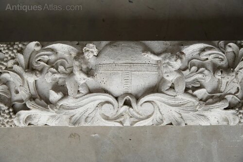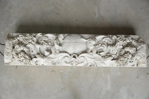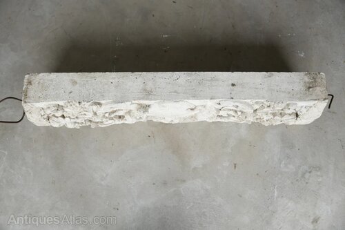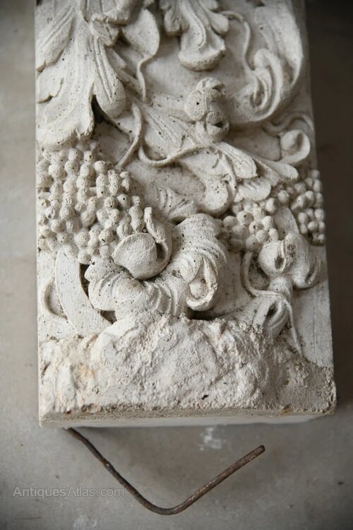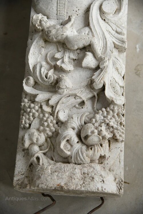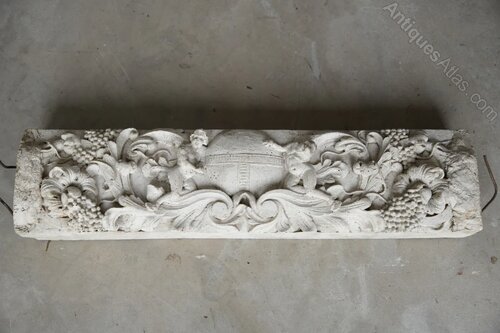 Cast Composite Stone Lintel. 20th Century composite stone lintel richly modelled in high relief. The lintel features a central cartouche flanked by two seated cherubs, surrounded by scrolling acanthus foliage and fruiting vine. A superb decorative element with strong period character and sculptural detail.