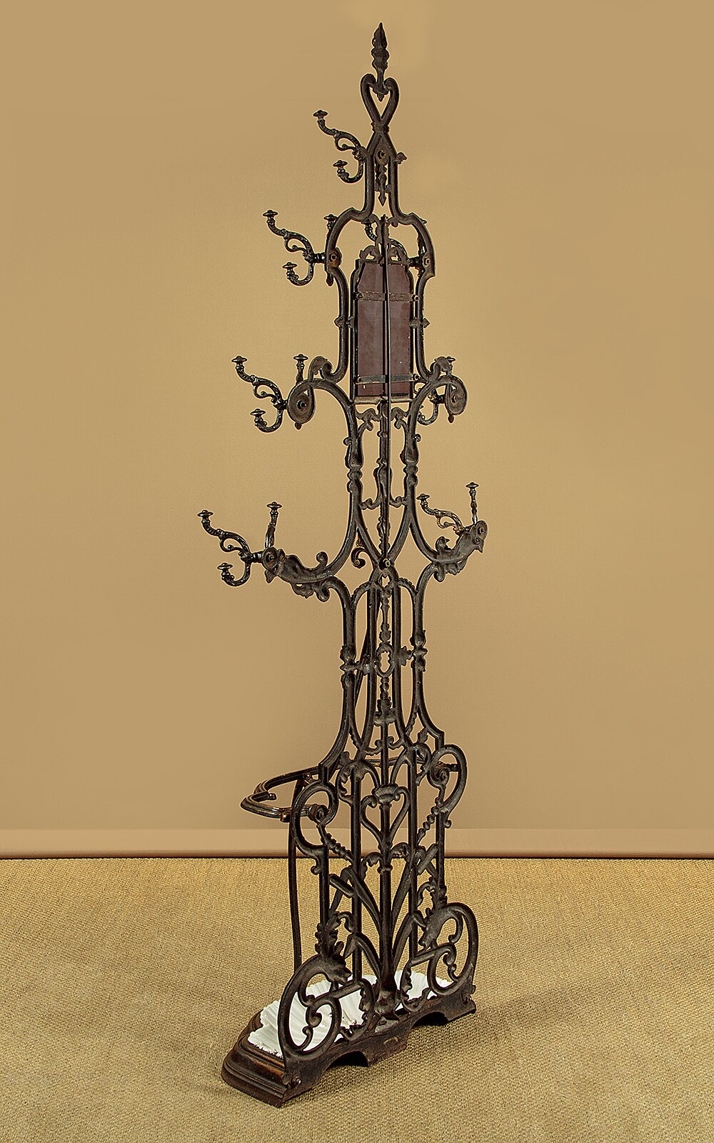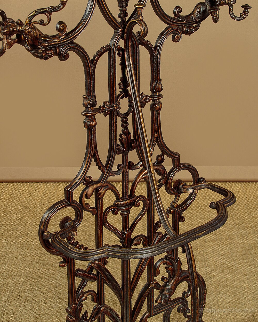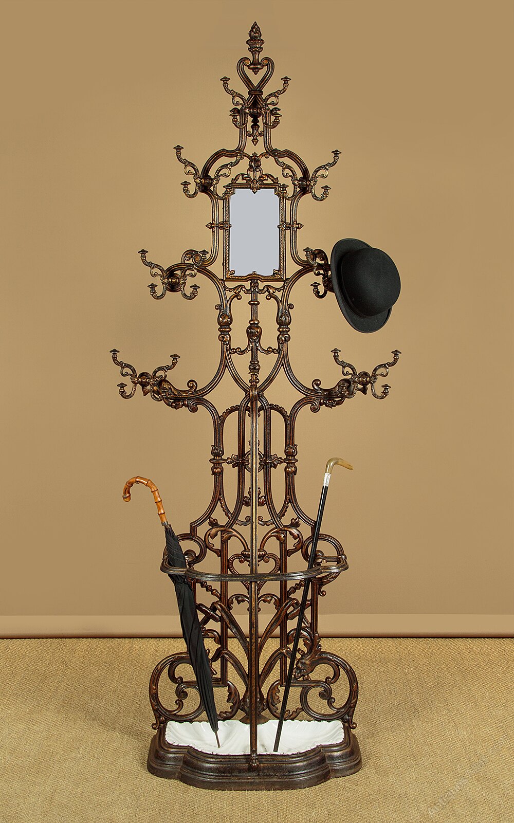 Beautiful cast iron hallstand c.1900. 14 double hooks for hats, coats and bags etc and a small mirror plate over a stay for sticks and umbrellas with a removable drip tray in the base. Very elaborate cast iron frame with decorative detail highlighted in gold. Note the grotesque heads at the base and the scalloped shape to the drip tray. Excellent condition.