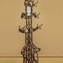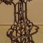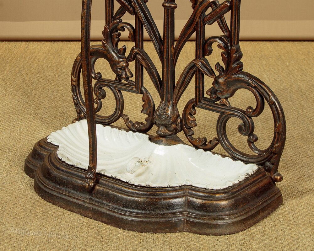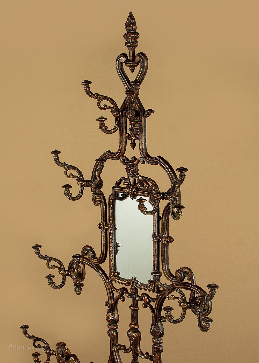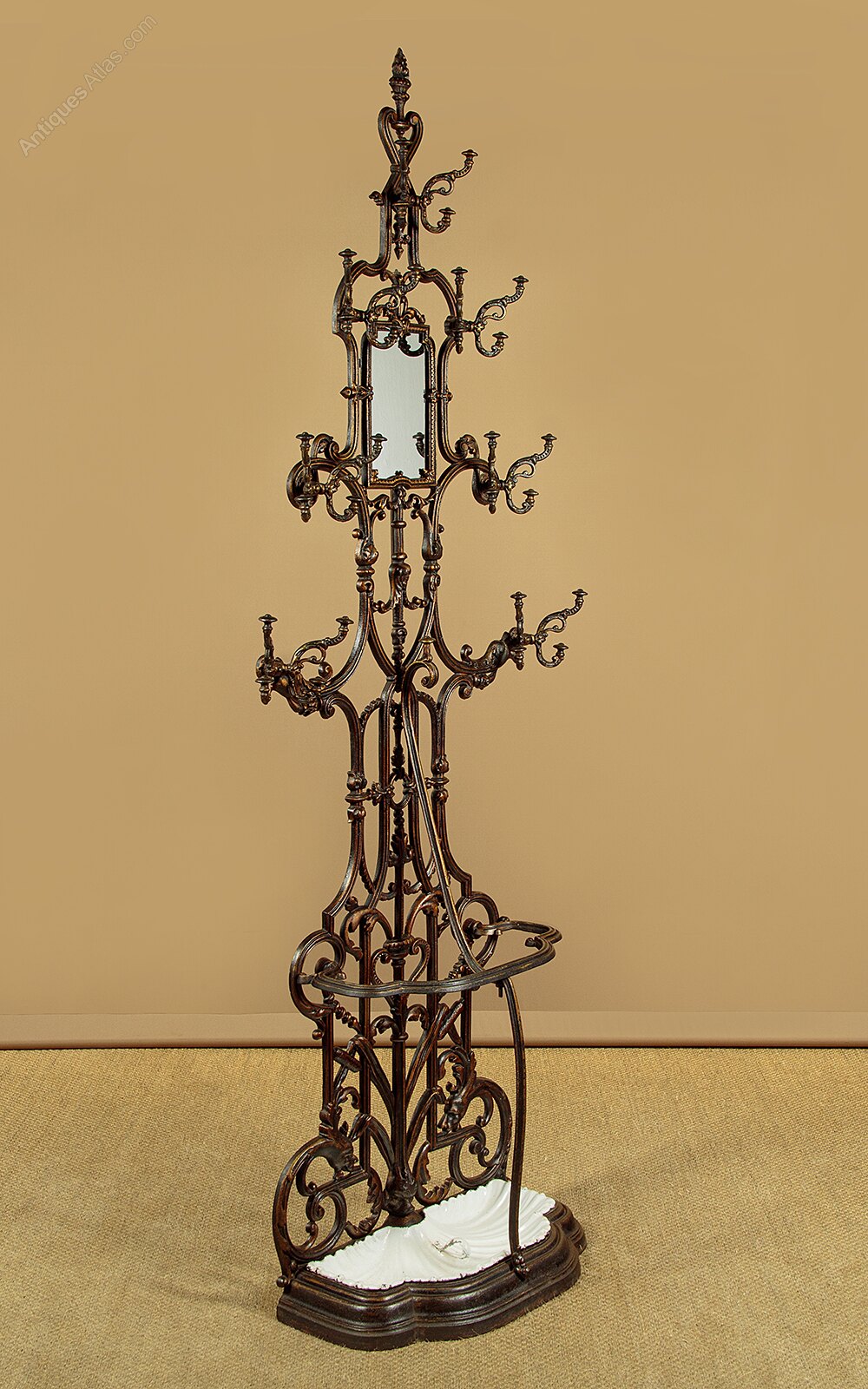 Beautiful cast iron hallstand c.1900. 14 double hooks for hats, coats and bags etc and a small mirror plate over a stay for sticks and umbrellas with a removable drip tray in the base. Very elaborate cast iron frame with decorative detail highlighted in gold. Note the grotesque heads at the base and the scalloped shape to the drip tray. Excellent condition.