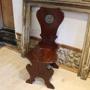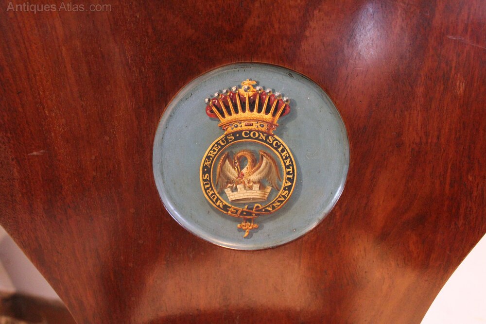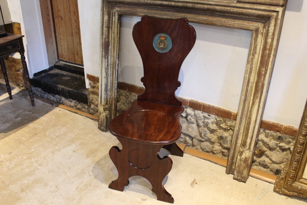 Here we have an outstanding early Victorian Mahognay chair c1840. The chair has stunning colour and patina. Made from the finest planks of solid Cuban Mahogany this chair by repute once resided in Lumley Castle home of the Lumley family since 1389 bio below. A version of the family crest is beautifully painted in the caruoche on the back. The seat is well shaped and dished and the legs are also well shaped and solid. A truly stunning chair with great history in excellent retail condition ready for your home. The dimensions are approx 100 cm high 43 cm wide 50 cm deep.