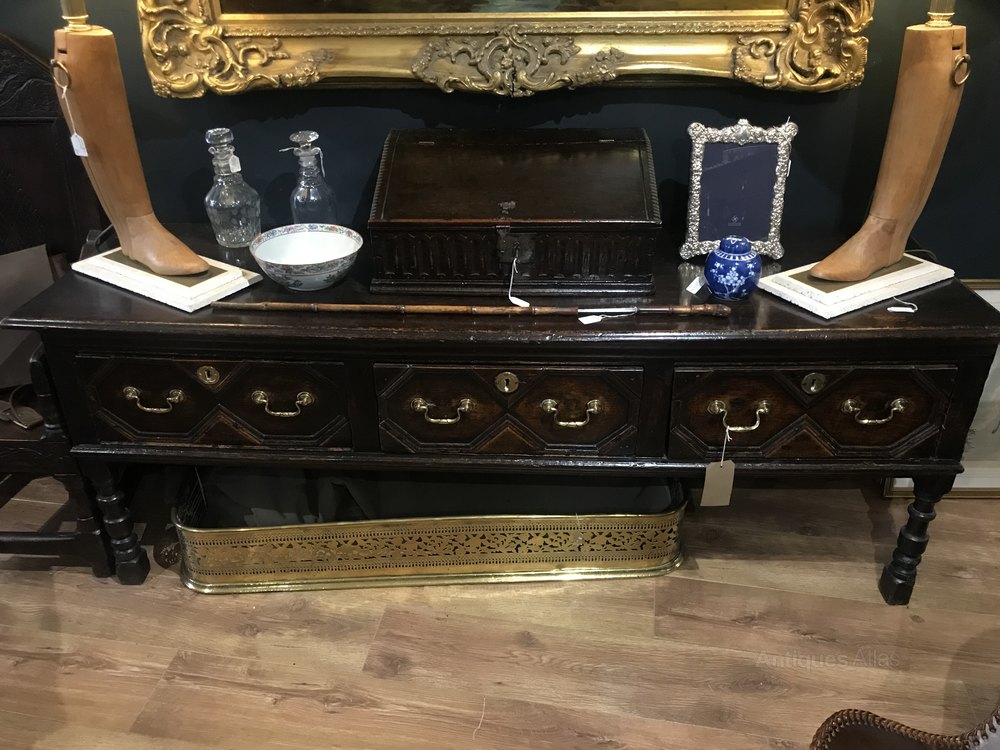 A wonderful Charles I Dresser Base in English Oak with deep patina and geometric fronted drawers. Raised on plaster and block back legs. Dated circa 1640.