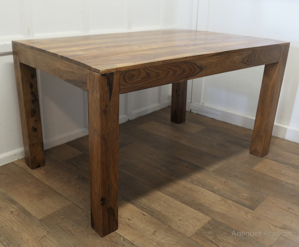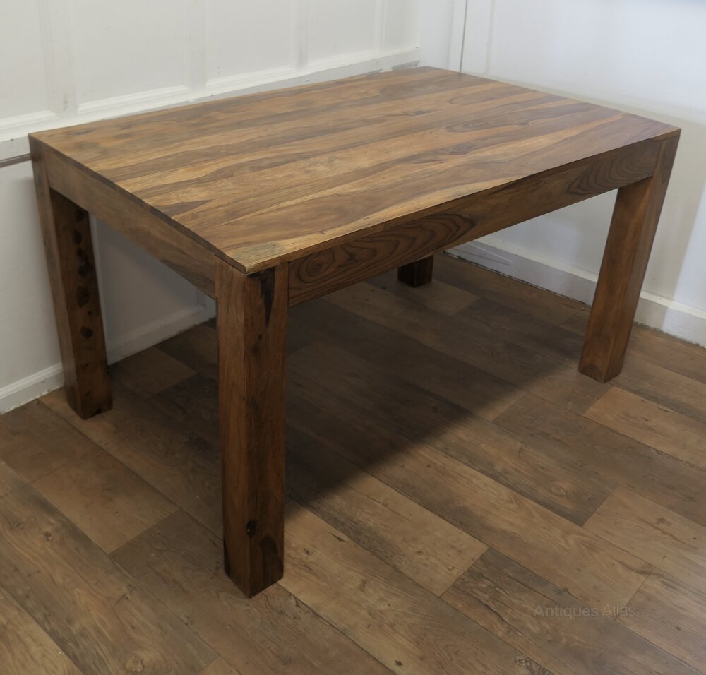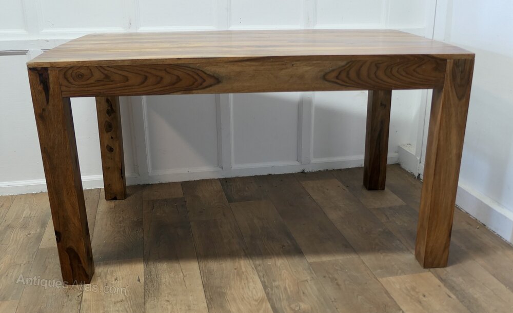 The table is made in a very decorative hard fruitwood it has sturdy 3.5”square legs with a beautifully figured 1” thick plank top