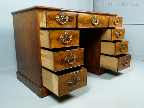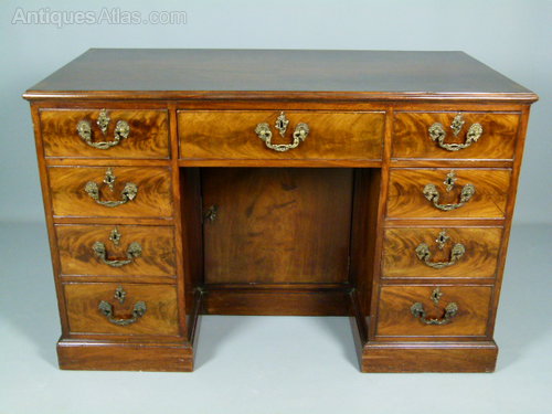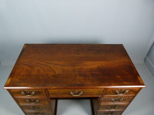 The mahogany top is cross-banded with a moulded edge, over an arrangement of nine graduating, cock-beaded drawers, and central kneehole cupboard, with fixed shelf within. Working lock and key.