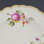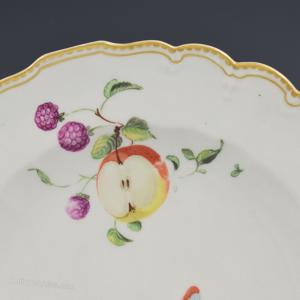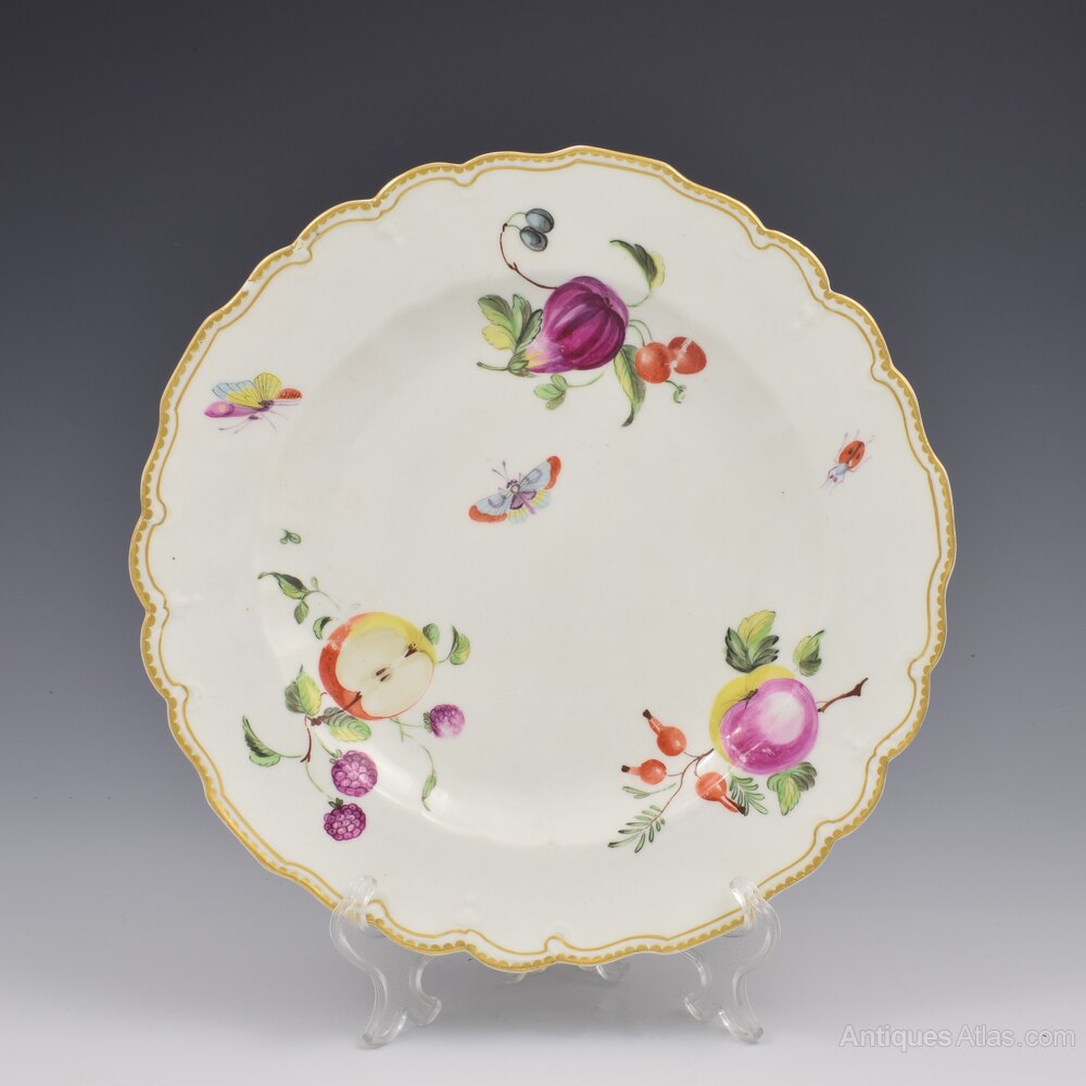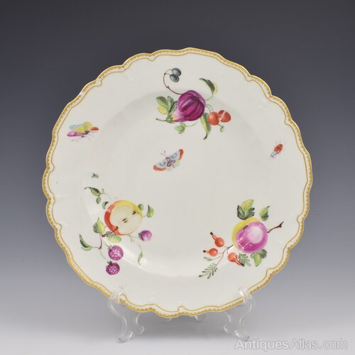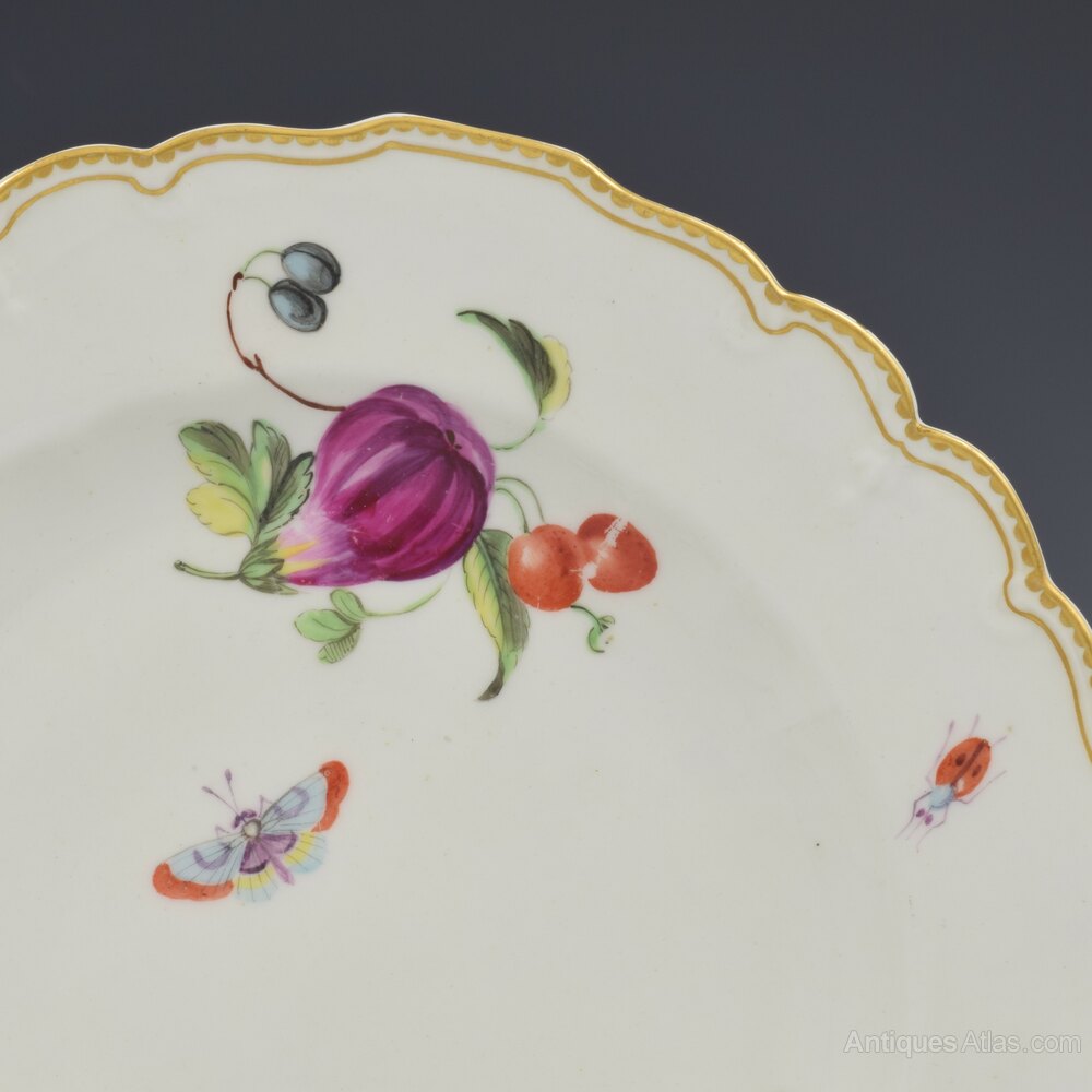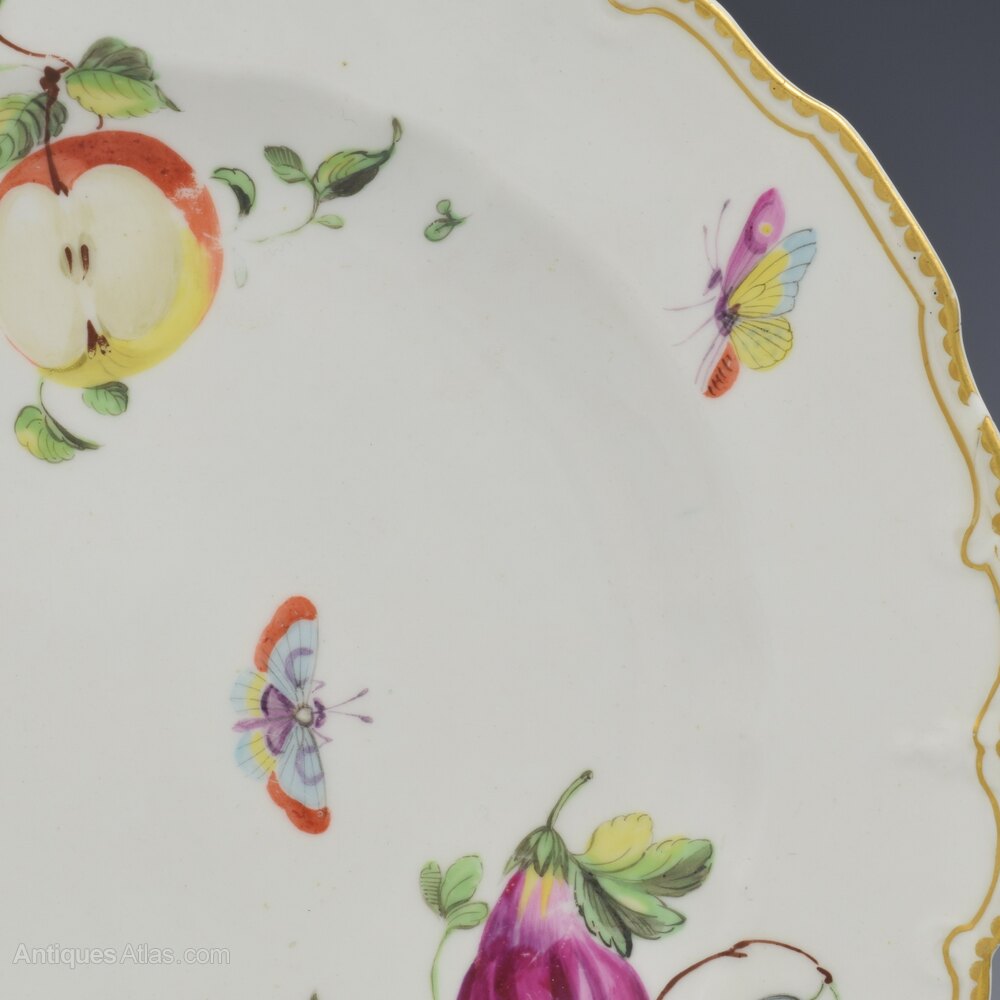 A very pretty Chelsea-Derby dessert plate with shaped rim and moulded coils and floral droplets around the rim. Decorated in the atelier of James Giles with three beautifully painted arrangements of fruit and wild berries with two colorful butterflies and a little red bug. Finished with a fine gilt line and dentil rim. Gold anchor to the reverse. c.1770,