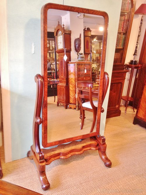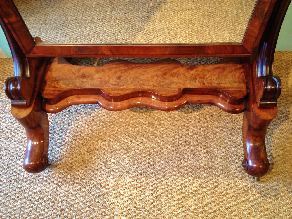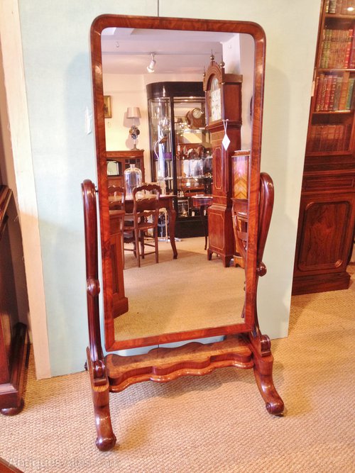 Attractive figured mahogany mirror of good height and condition. English c 1880. This mahogany cheval mirror is in wholly original condition and has been well maintained over the years. The mirror is bright and clear and of full height. The brass fly nuts maintain the required mirror angle and the entire mirror is solid with no wobbles. Shown here in best showroom condition, this lovely mirror is ready for use.