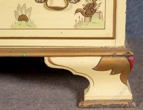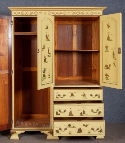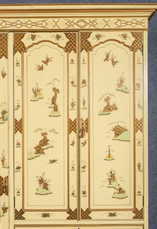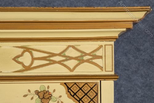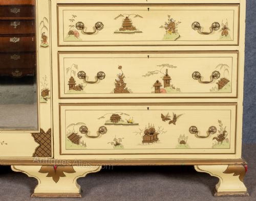 An unusual Chinoiserie decorated compactum wardrobe from the Edwardian Era. The moulded cornice and frieze having gilded highlights above a large single door with shaped and beveled edge mirror, the 2 panelled doors open to a shelved interior with 3 graduated drawers below. The cream ground with Chinoiserie decoration and gilded highlights throughout and all raised on ogee bracket feet. Transports in 4 pieces and in very good condition. Dimensions:- Height…81.5’’/ 207cm. Width…61.25’’/ 156cm. Depth…19’’/ 48cm + cornice. Delivery to most of U.K. mainland £95.