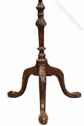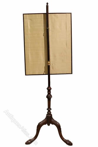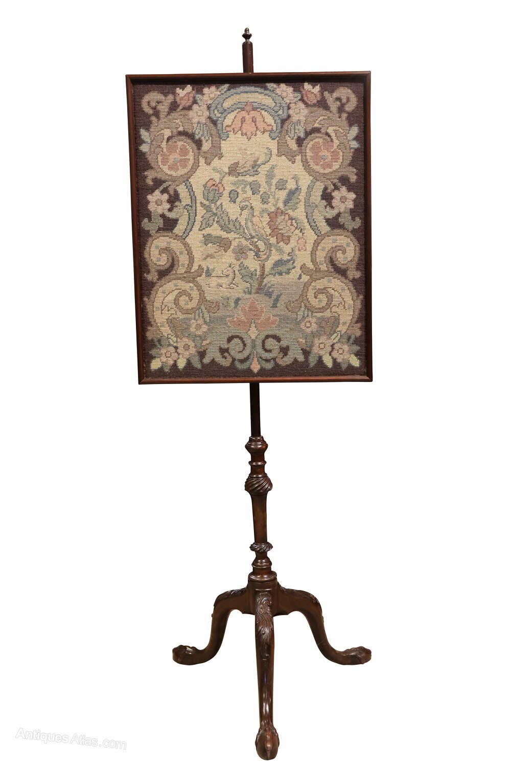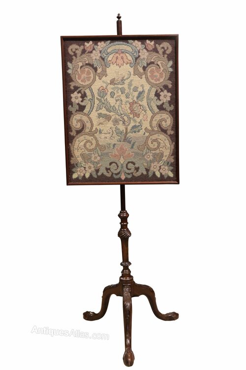 A fine George III Chippendale mahogany pole screen, dating to around 1770, featuring a richly carved tripod base with acanthus detail and elegant ball-and-claw feet. The adjustable screen showcases a later 19th-century needlework panel, beautifully hand-stitched with scrolling foliage, floral motifs, and a central bird design in soft muted tones.