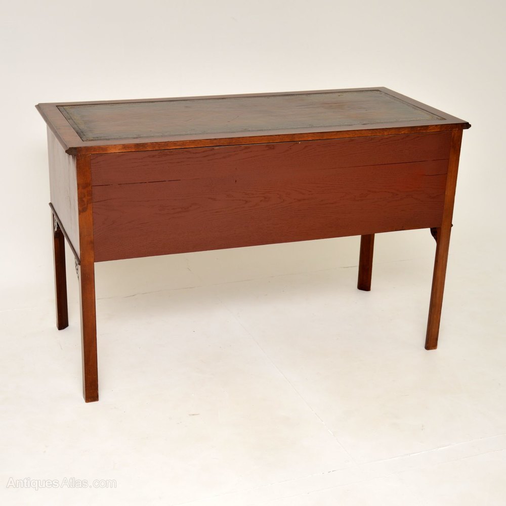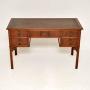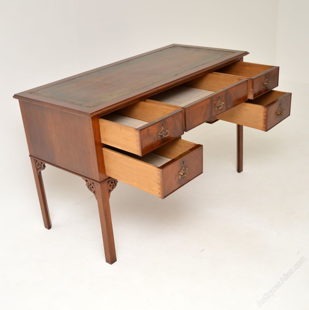 The quality is excellent and this is a very useful size. The mahogany has beautiful grain patterns, a lovely colour and gorgeous overall patina. There are pierced fretwork brackets at the top of each leg, this has original brass handles and a wonderful tooled green leather top.