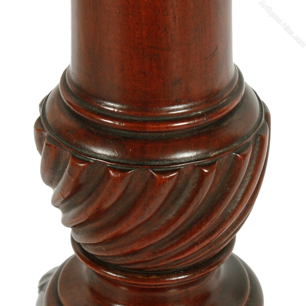 The table has a pillar support that has a spiral carved urn at its base.