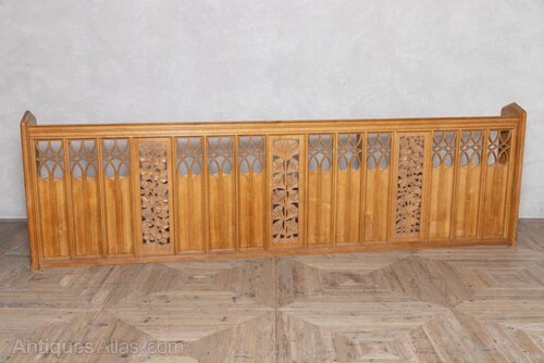 These intricately detailed panel frontages offer remarkable versatility. They can be thoughtfully repurposed as statement wall panelling, creating dramatic focal points in bathrooms, bars, or bespoke interior projects. Masterfully crafted from solid English oak, they introduce rich warmth, dimensional texture, and authentic historical character to any sophisticated setting. Please note that we have a large amount of carved panelling not yet listed, and various furniture from the same church available.