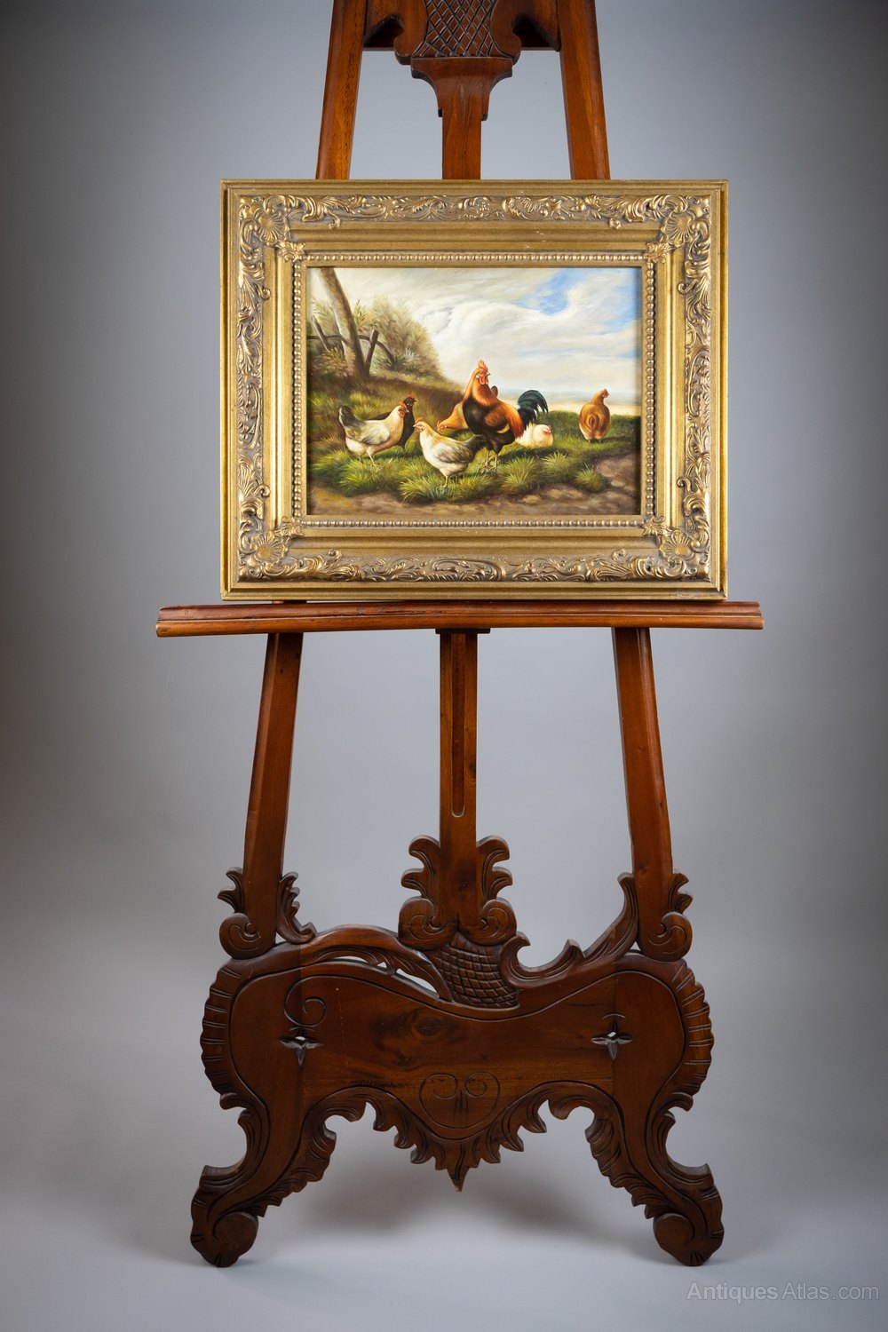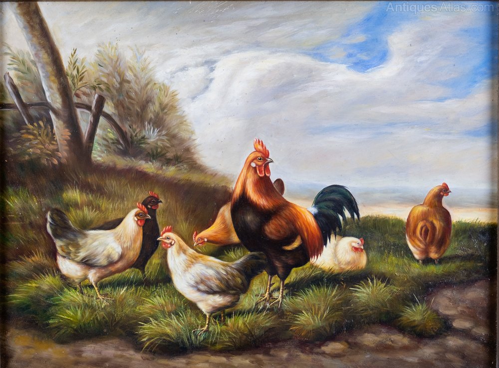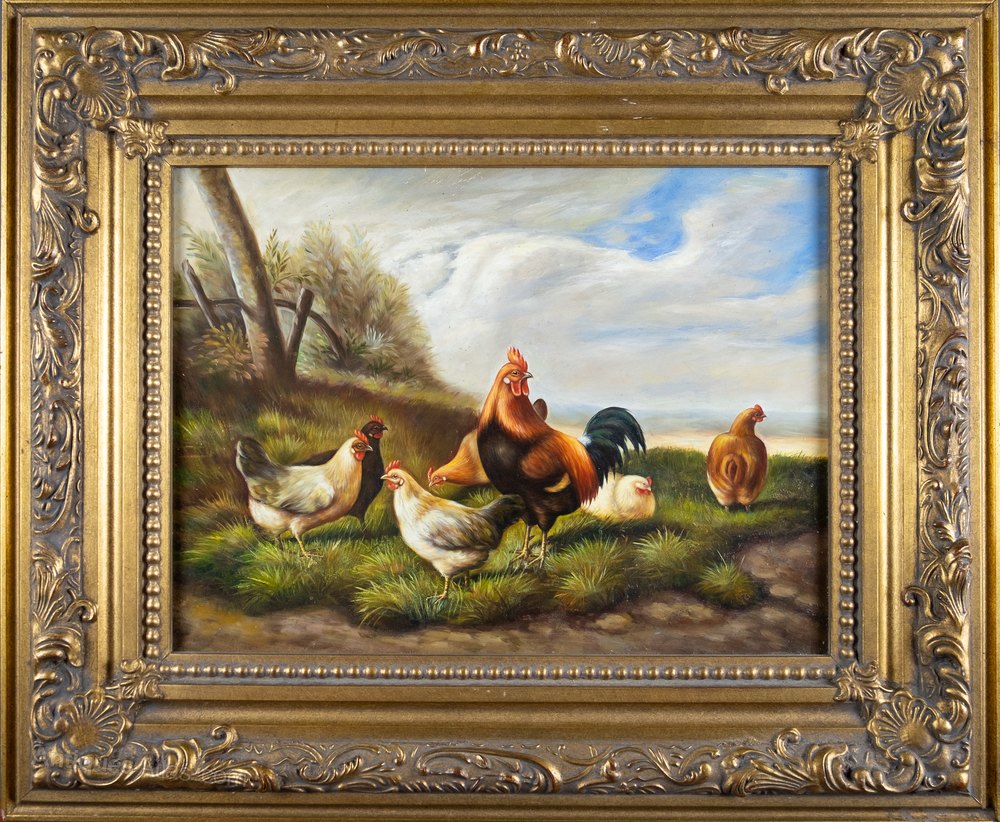 A central rooster stands amongst six hens in a farm under cloudy blue skies with a landscape stretching off into the distance. The painting is very well executed with excellent use of both colour and light. The work is housed in a gilt wood frame. Both the work and frame are in very good condition.