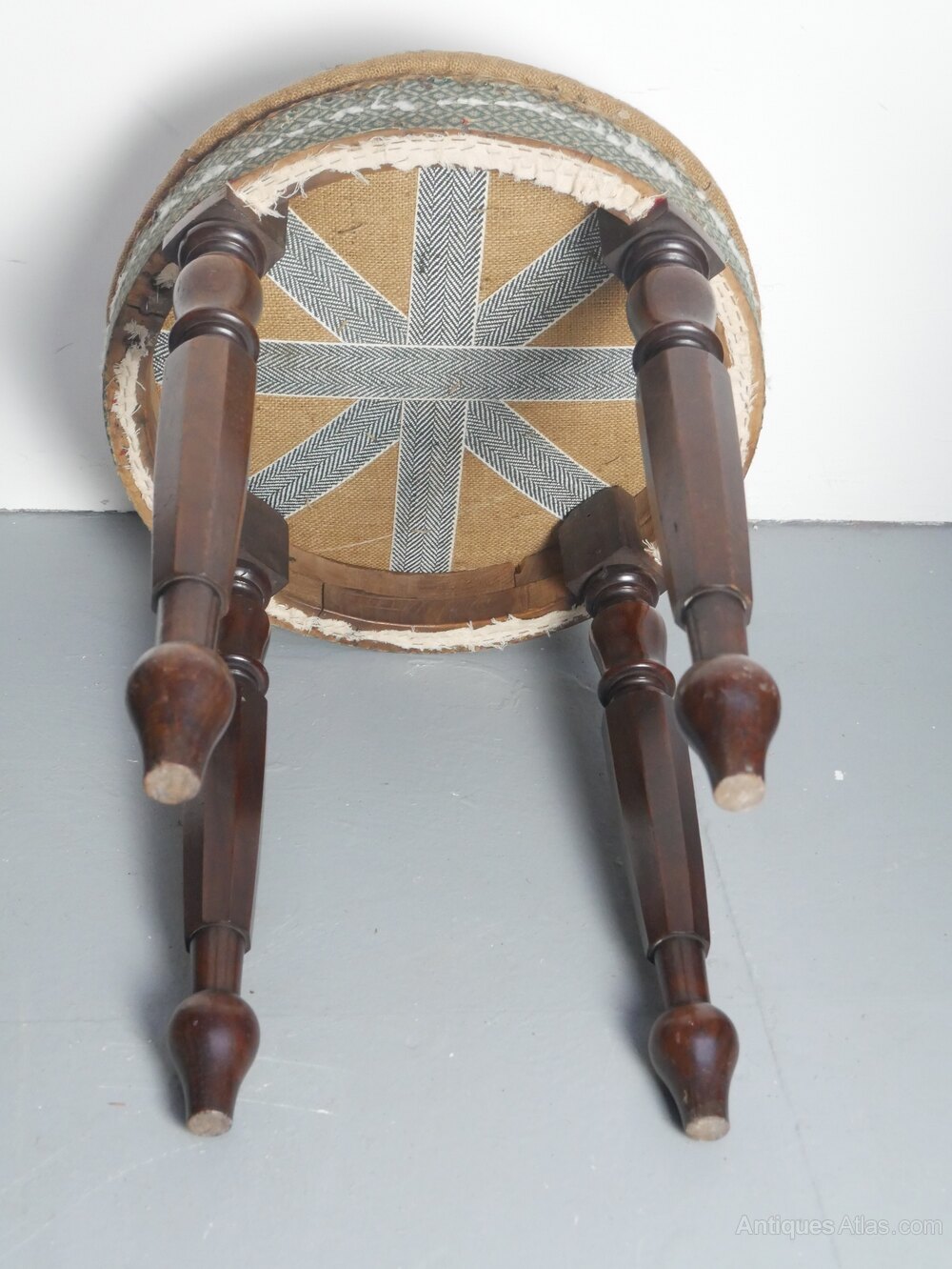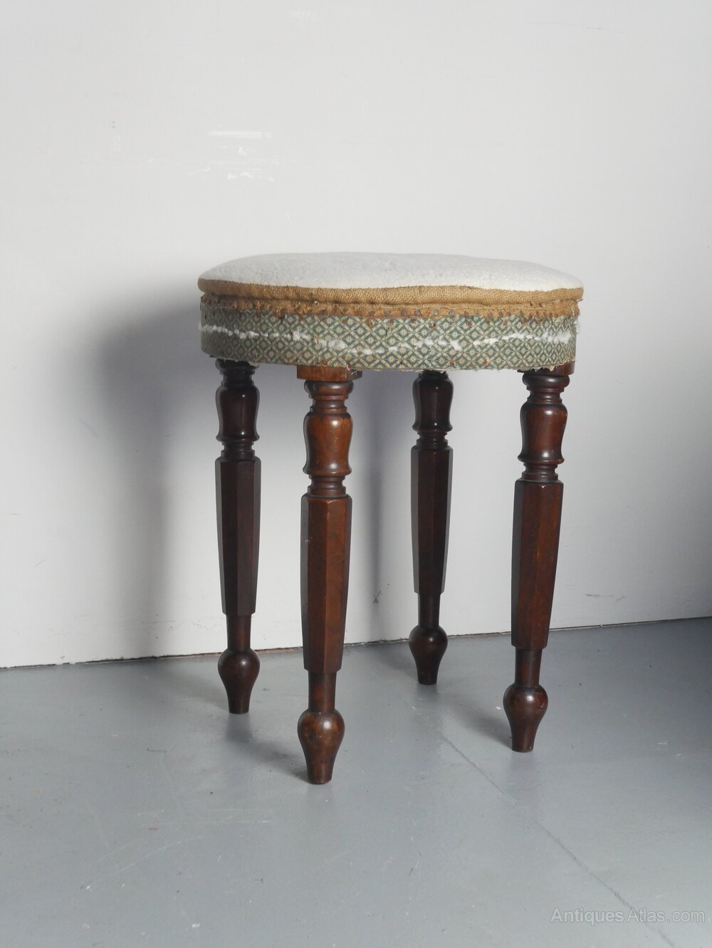 A very good quality circular top stool. of unusual height 58.5cm, standing on excellent mahogany turned legs. A very stable stool. made around 1840-1850, for upholstery, all in strong condition.