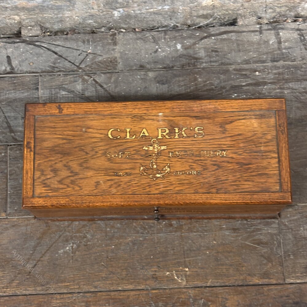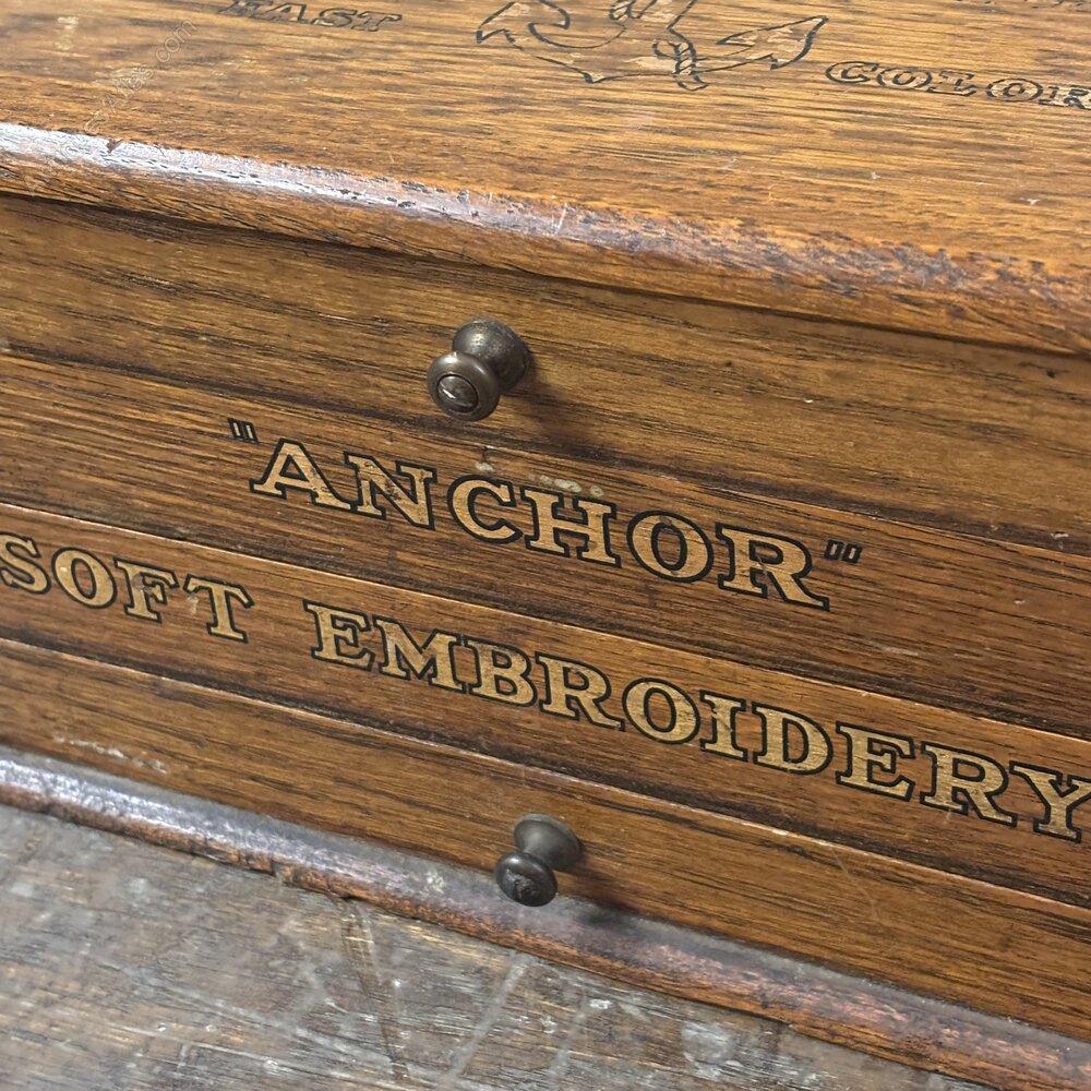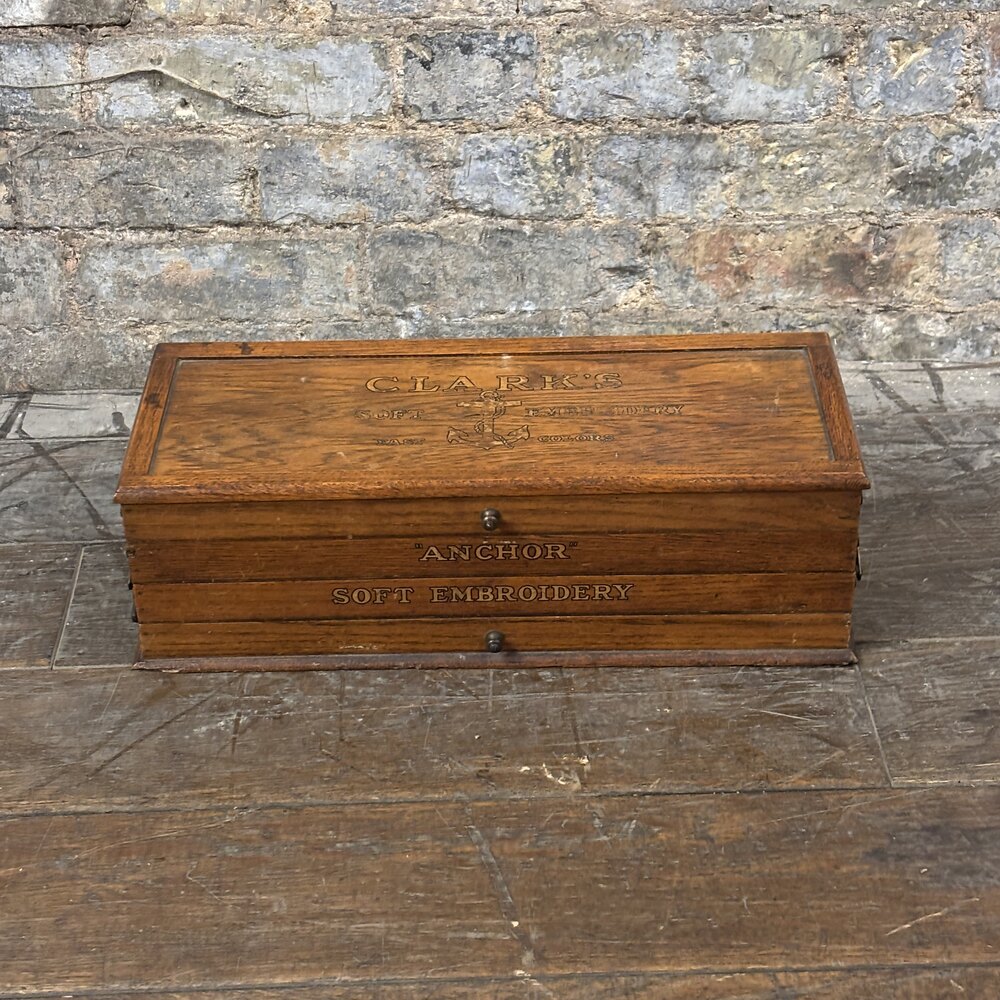 The top and front are clearly marked “Clark’s Soft Embroidery – Fast Colour” with the distinctive anchor logo. The cabinet opens via a clever cantilever mechanism, revealing three tiered display trays originally used to hold lengths of embroidery thread in a shop setting. Ideal for use as a collector’s piece or for display in a retail or domestic interior.