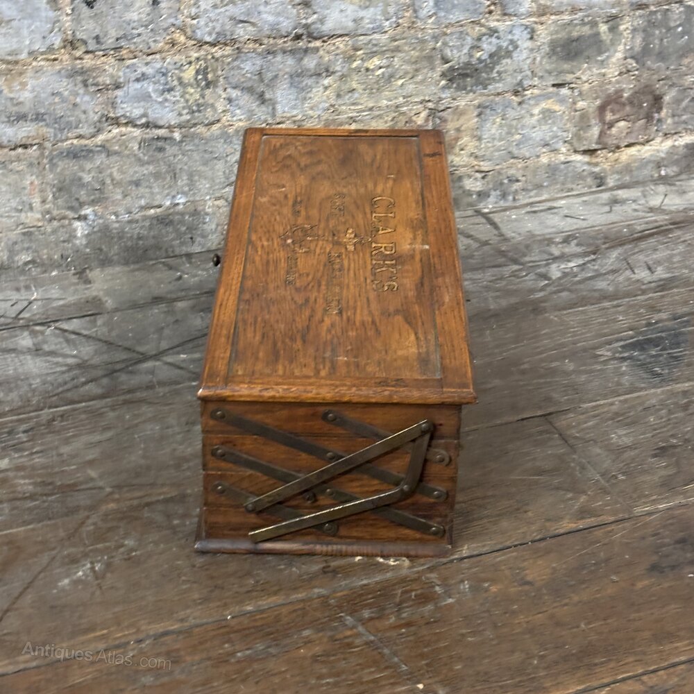 Early 20th-century Clark’s “Anchor” Soft Embroidery folding display cabinet, constructed in oak with brass fittings and original gold painted lettering.