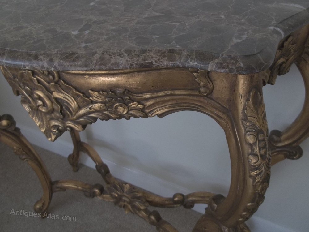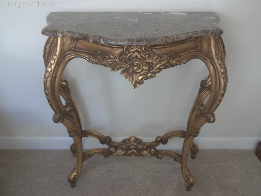 Rococo style gilt wood marble top Console table of small proportions. Signs of wear but in sound condition with a