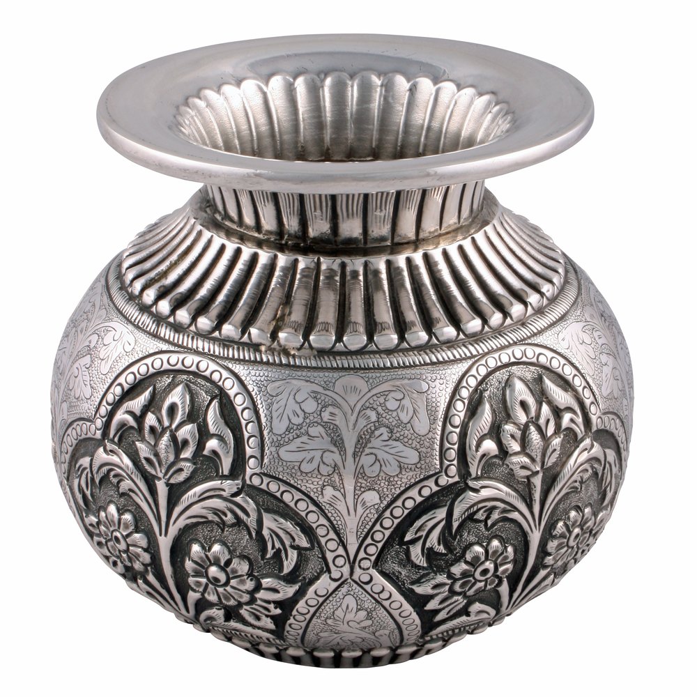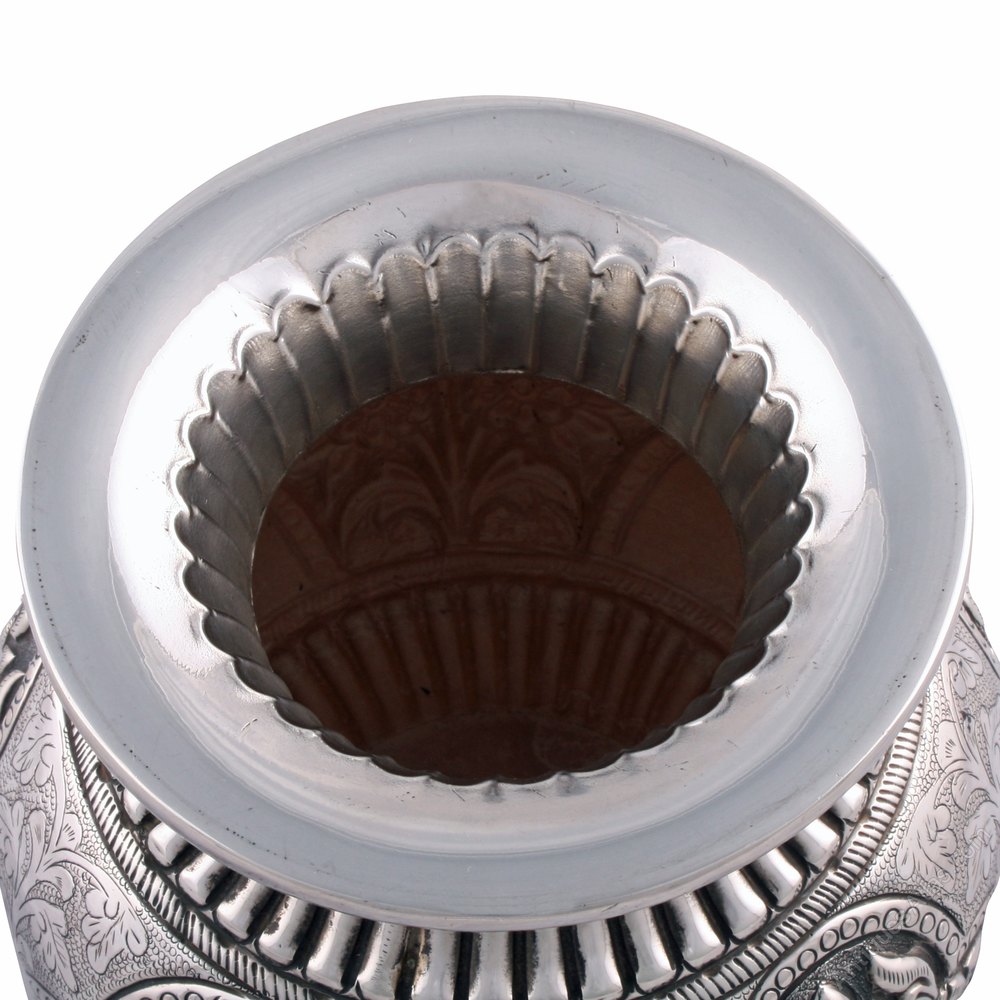 The vase is made from heavy gauge silver and has a deeply embossed decorated body.