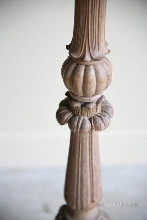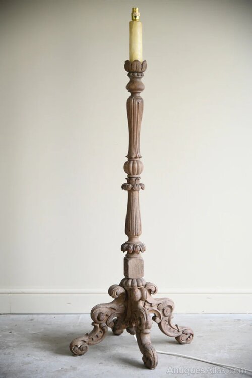Continental Oak Standard Lamp. Early 20th Century carved wooden floor lamp base of classical influence, featuring a richly detailed column and scrolling tripod base. The turned and fluted central stem is carved with stylised acanthus and baluster elements, rising from an ornate base with three boldly scrolled legs.