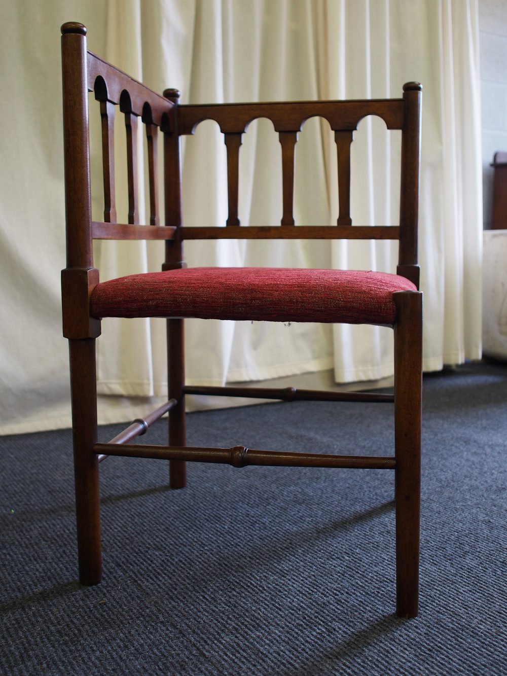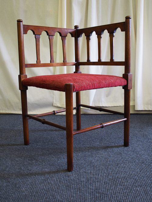 Arts and Crafts corner chair in mahogany, with upholstered seat, standing on turned legs with columned back.