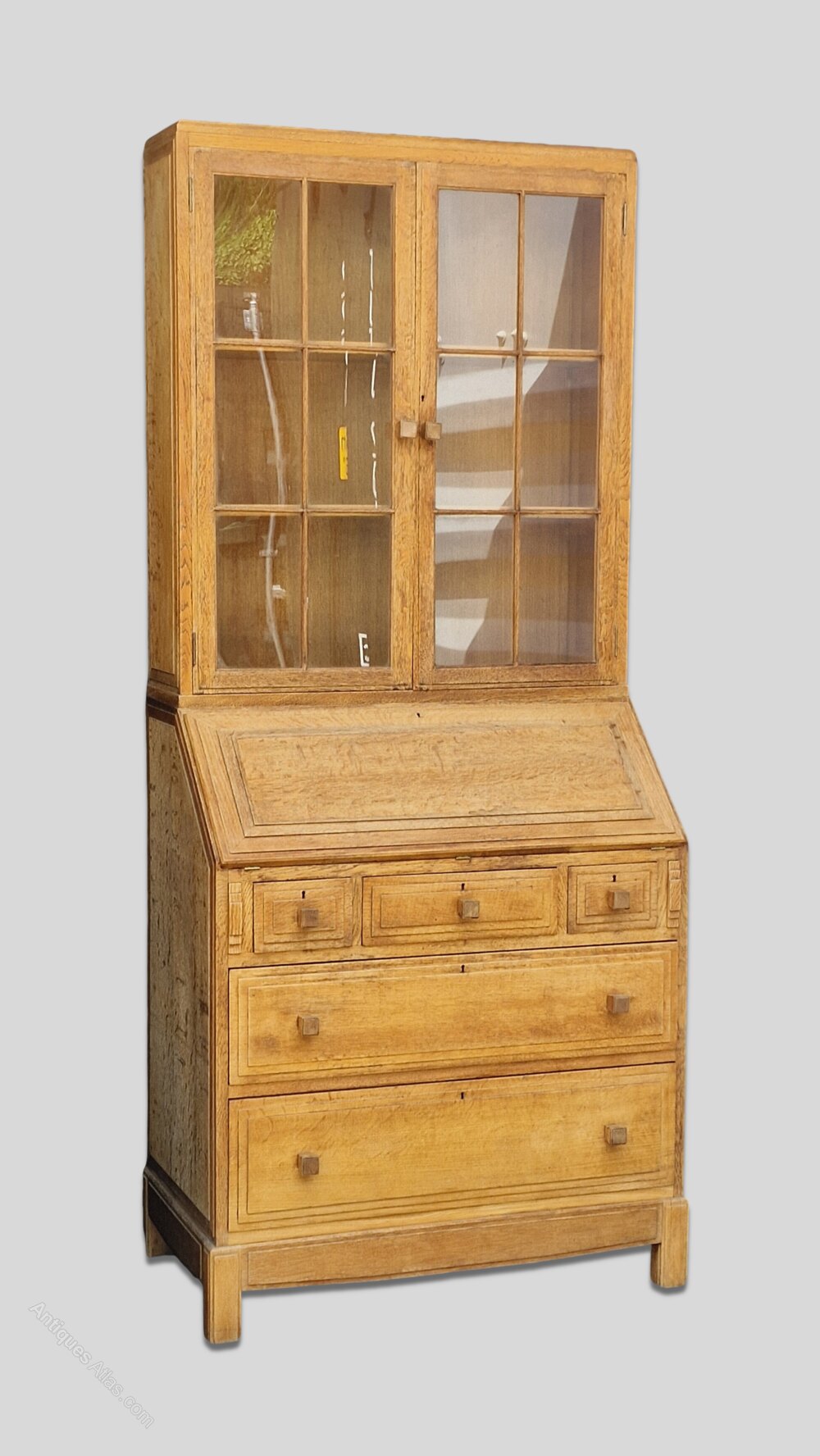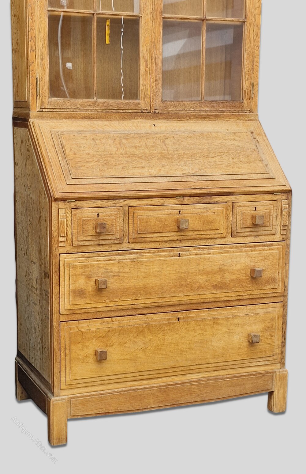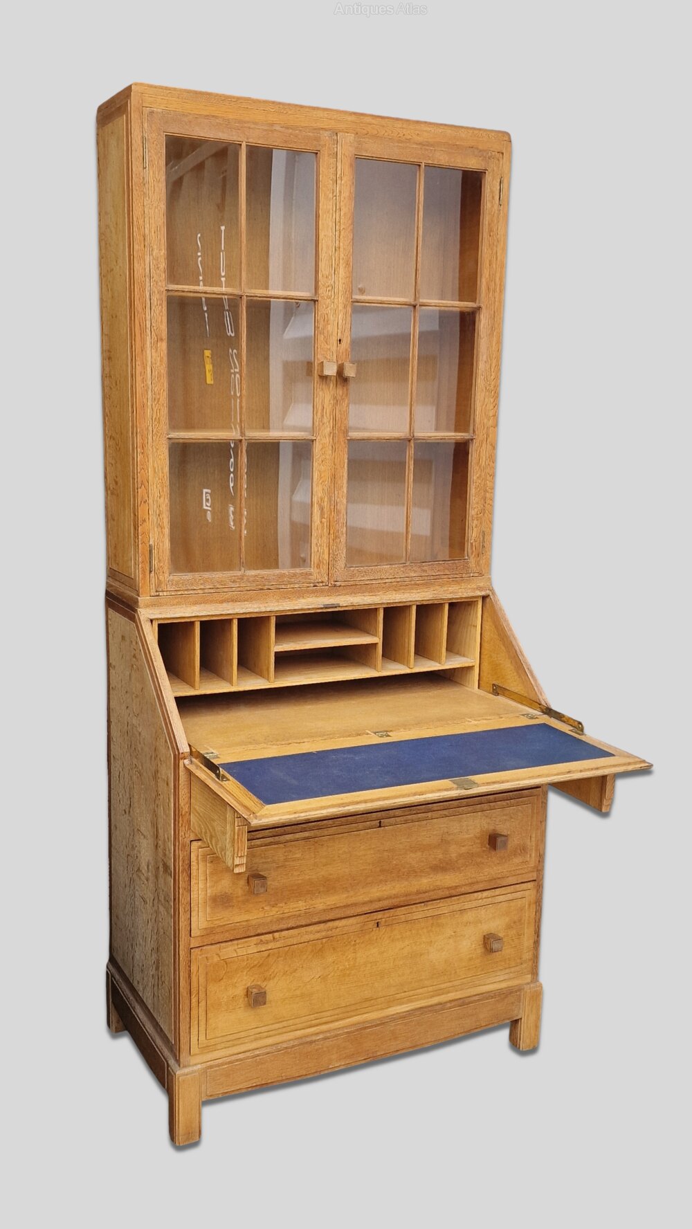 An Arts & Crafts Cotswold Style oak bureau bookcase designed by Paul Matt for Brynmawr Furniture c.1930. A glazed, double door bookcase over a generous fall-front desk, over an arrangement of three over two drawers.