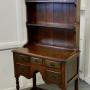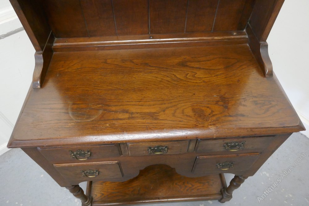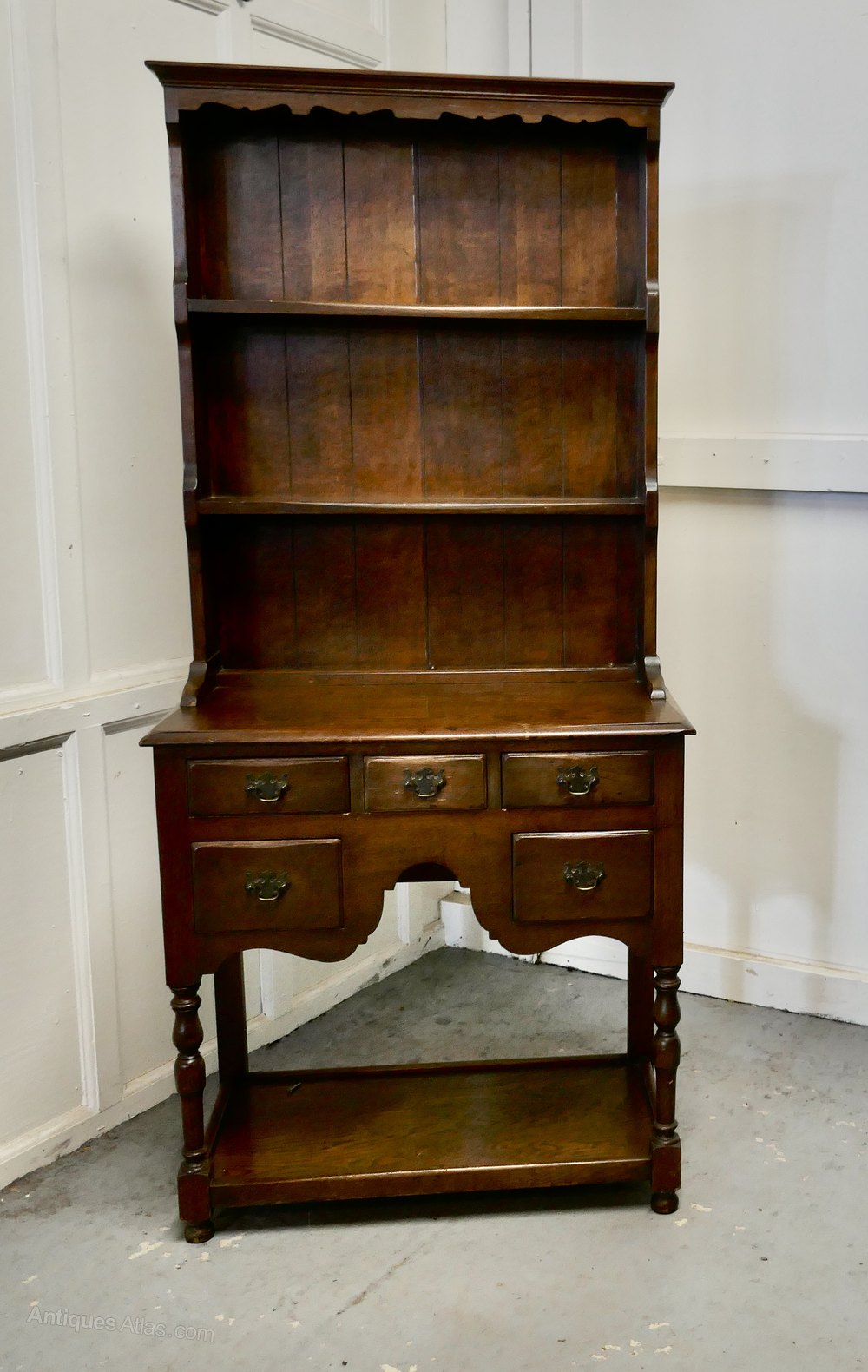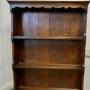 The dresser has a shelved top with 2 shelves which have plate rails and it has a scalloped cornice.