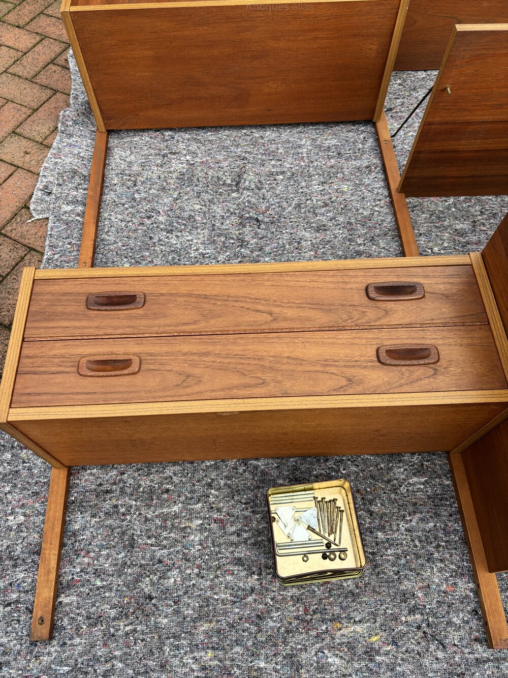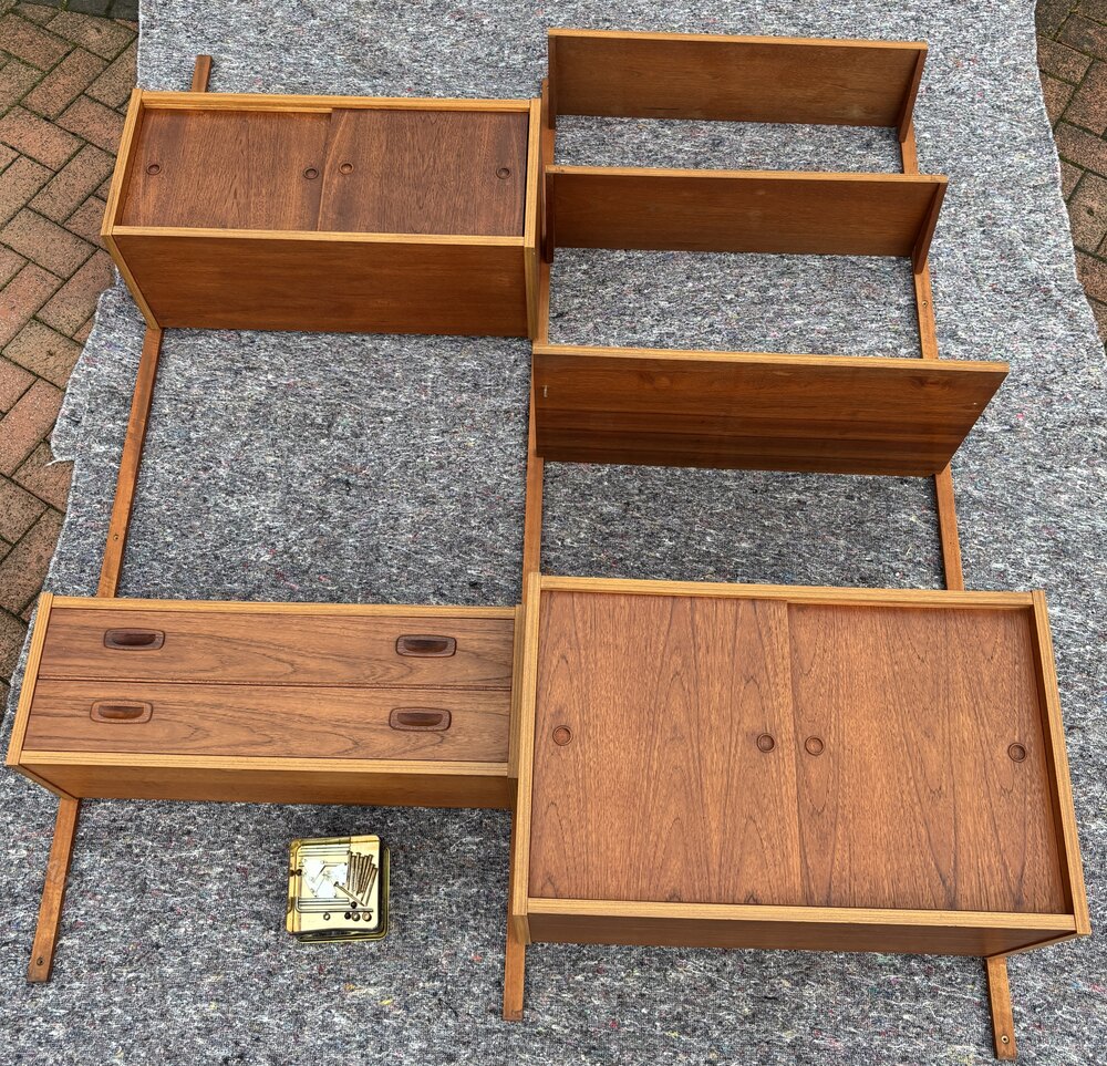 Mid Century 2 bay teak wall mounted shelving, known as a PS System after the designer Prebend Sorensen, and manufactured in Denmark by Randers Mobelfabrik c1950's/60's. Each shelf is independently hung on the brass suspension arms which are inserted into the wall supports, adjustable to any height. The cabinets are hung on brackets and pins, and again adjustable to any height.
