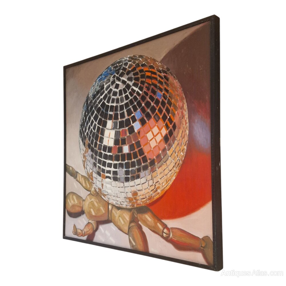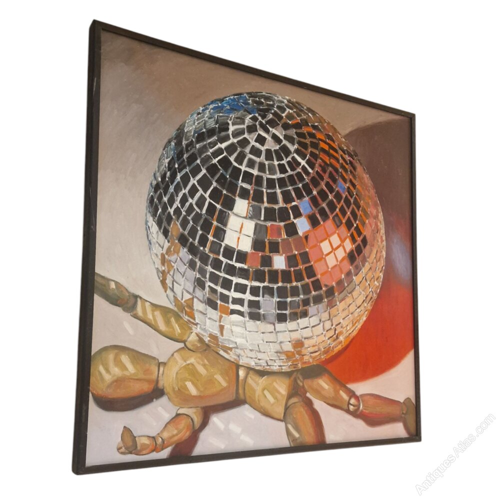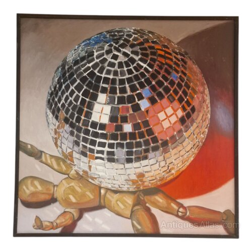 'Death by Glitter Ball' is an original oil painting dated 2002 by Derek Carruthers (1935-2021) - a prolific and renowned British Post War and Contemporary artist who was born in 1935. This dramatic and humorous original oil painting shows a featureless lay figure or artists' wooden model of a human being - being squashed by a gigantic 2D glitterball at a disco! The bespoke frame has been hand painted by the artist in a slightly distressed style which works well with the style of the painting.