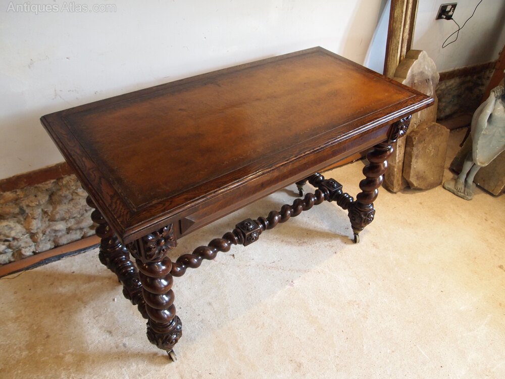 Here we have a wonderful Victorian Oak writing desk c1880. As you can see the desk has outstanding colour and patina. There is a tooled and gilded leather skiver to the top. The top has a shallow Oak border with moulded edge. There are two end secret drawers to the centre and two further secret drawers at the top of the legs which are disguised as the carved flower head decorations. The legs are beautifully turned into a fantastic barley twist. There are further carved flower hards to all points and an adjoining H stretcher below. The whole sits on original casters. A stunning desk in great retail condition ready for your home. The dimensions are approx 120 cm wide 60 cme deep 76 cm high.