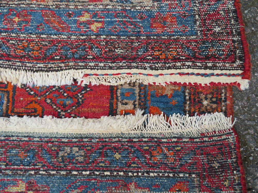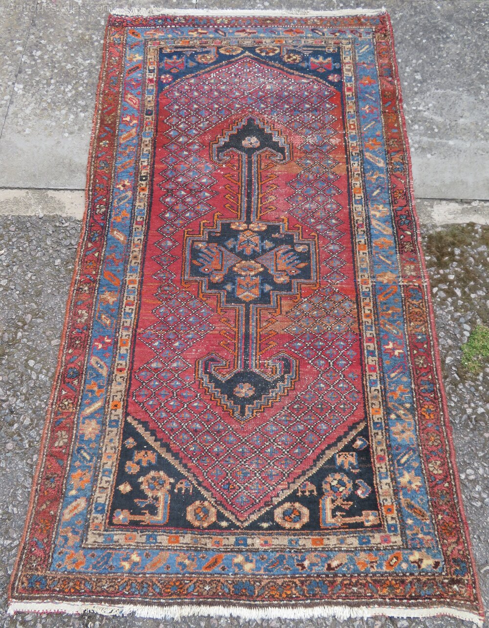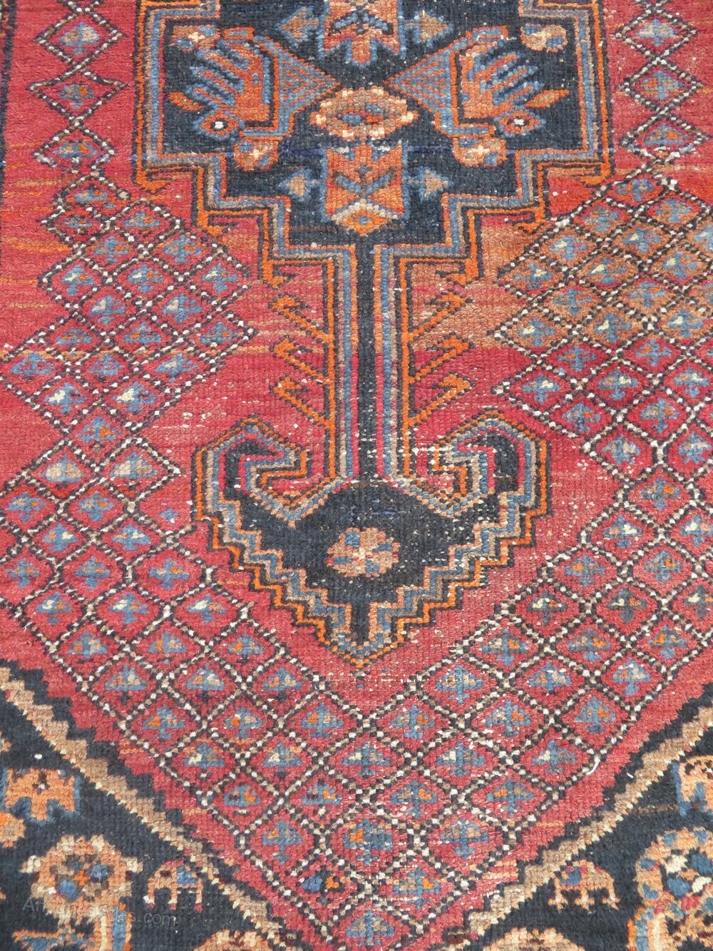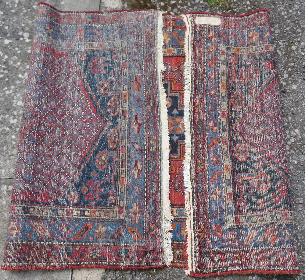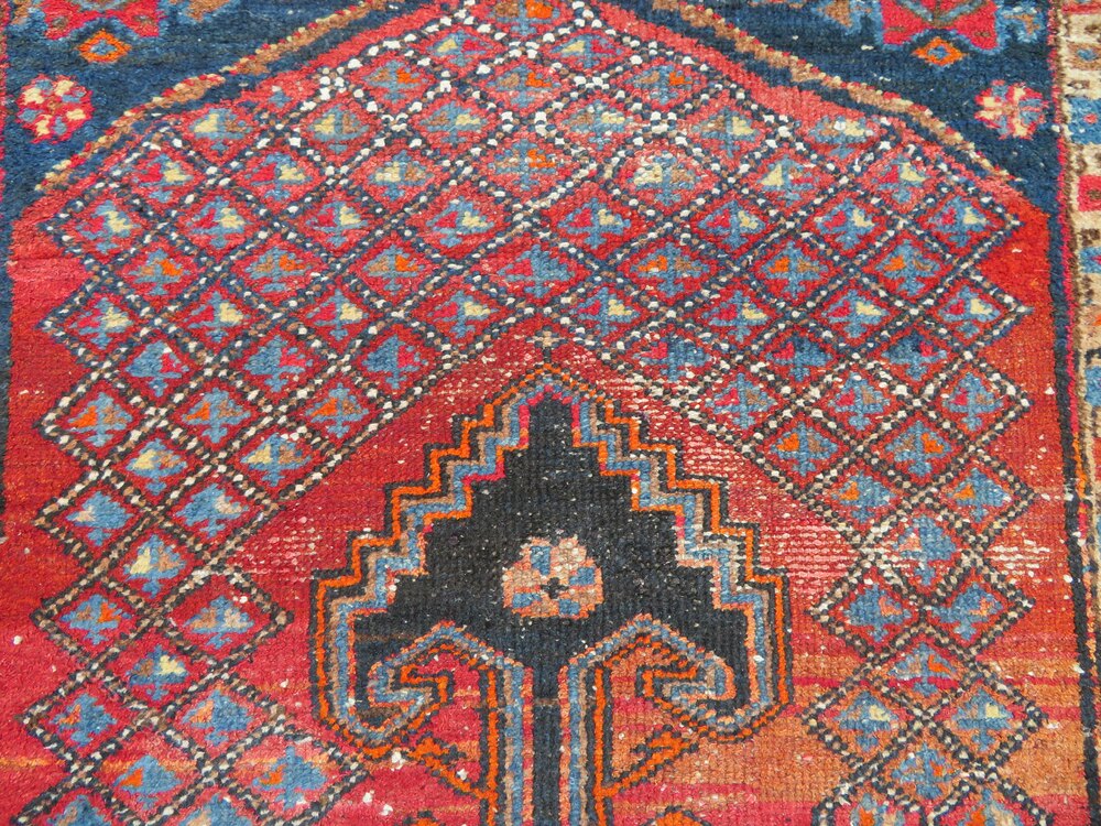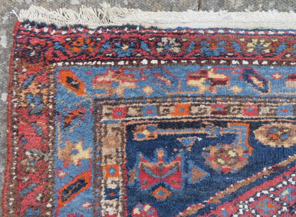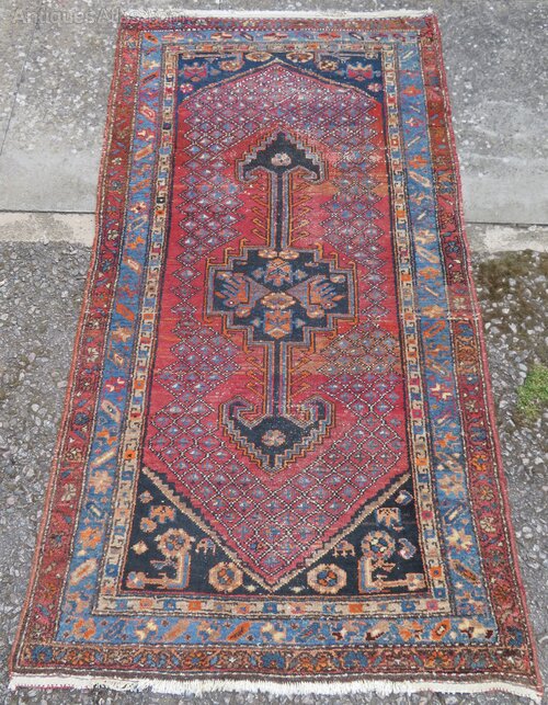 Distressed antique sarab rug. North west persia. 189cm X 104cm. First quarter 20th century. North west persia. Sarab type rug in slightly distressed condition with some pile wear and bit fringe wear and loss. Central geometric medallion with arrow pointers. 6 foot 2 inches by 3 foot 5 inches. 189cm X 104cm. At widest points. Fringes not measured in size. Wool pile cotton foundations. Offered at a great affordable price. £285 gbp. U. K post £20. Country house and eastern interiors selling very affordable rugs. Ztr 140