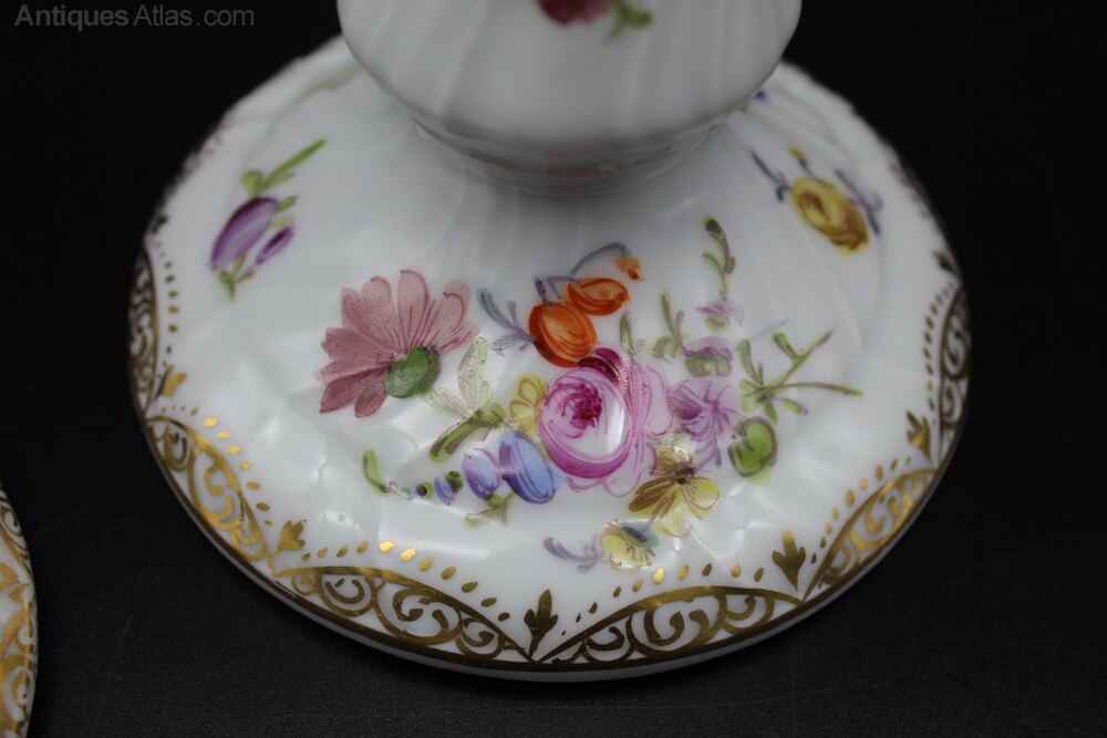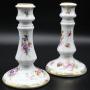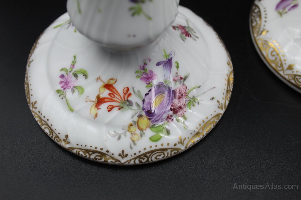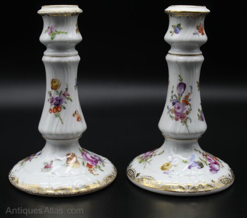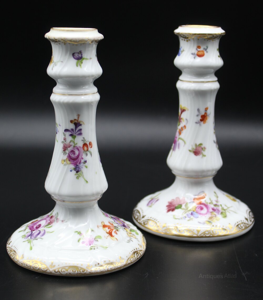 Lovely pair of Dresden porcelain candlesticks. Beautiful hand painted floral decoration and gilding. 16.5cm high, 1.5cm diameter base. Minor rubbing to gilding around the top of one of the candlesticks. 19th Century C1880. A matching bowl is also available - see listing.