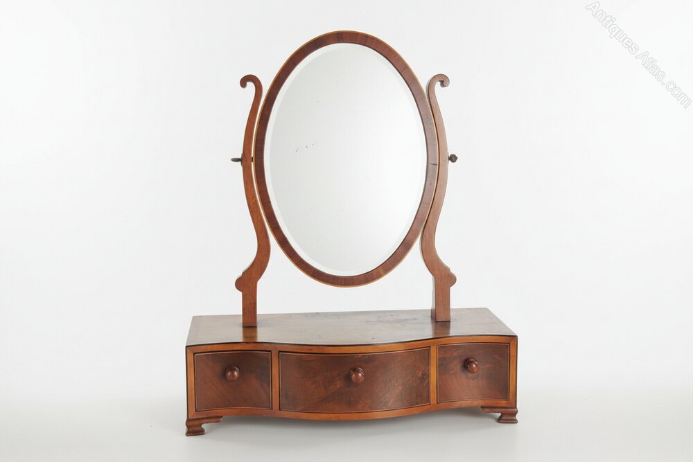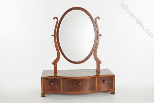 Serpentine fronted George III dressing table mirror/toilet glass, for the lady in your life. This beautiful object is a great example of the workmanship from the late 18th century. This piece has three drawers and is inlaid with various woods, it sits in ogee bracket feet and has a lovely rich patina.
